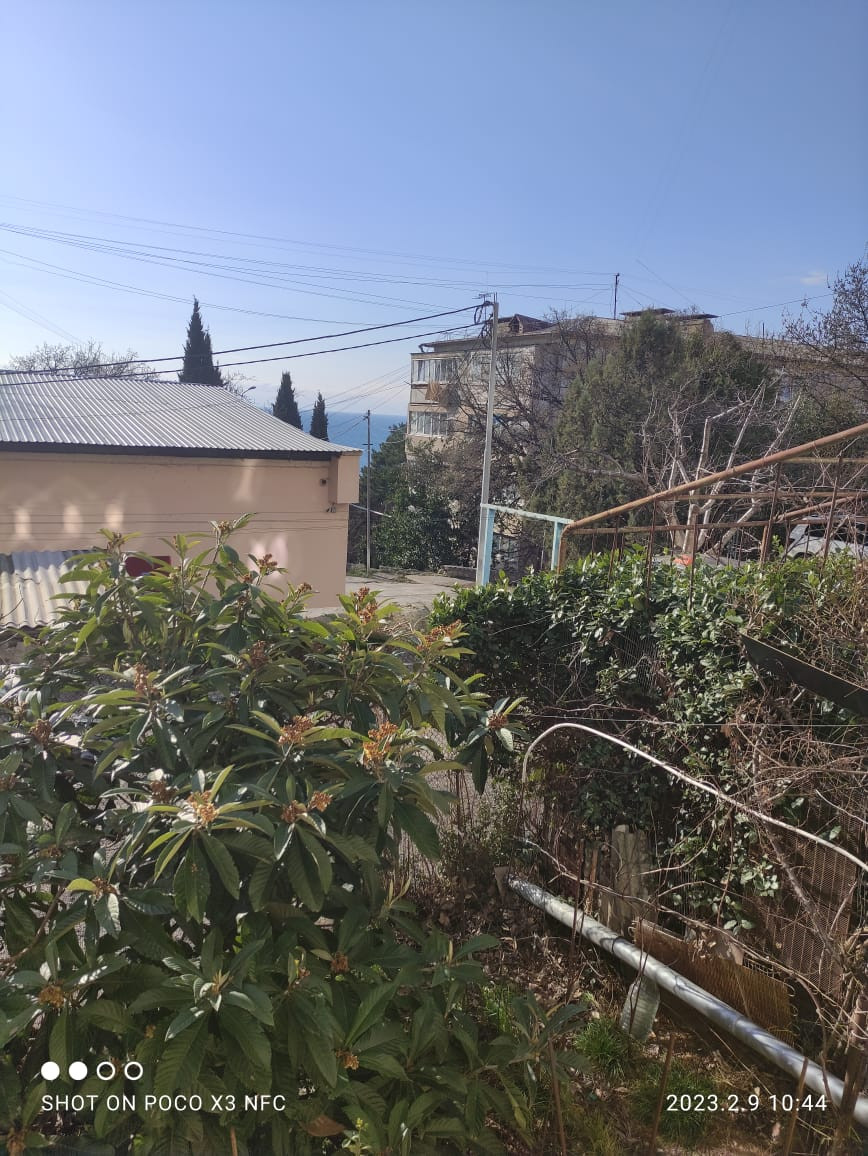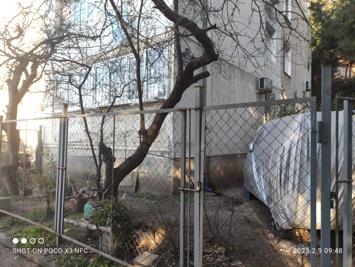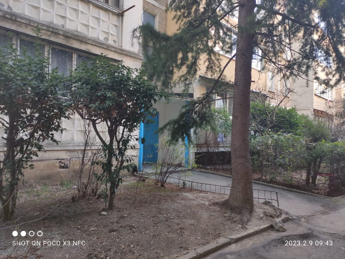 Окна квартиры выходят на солнечную сторону. Двор вокруг утопает в зелени вечнозелёных крымских сосен.