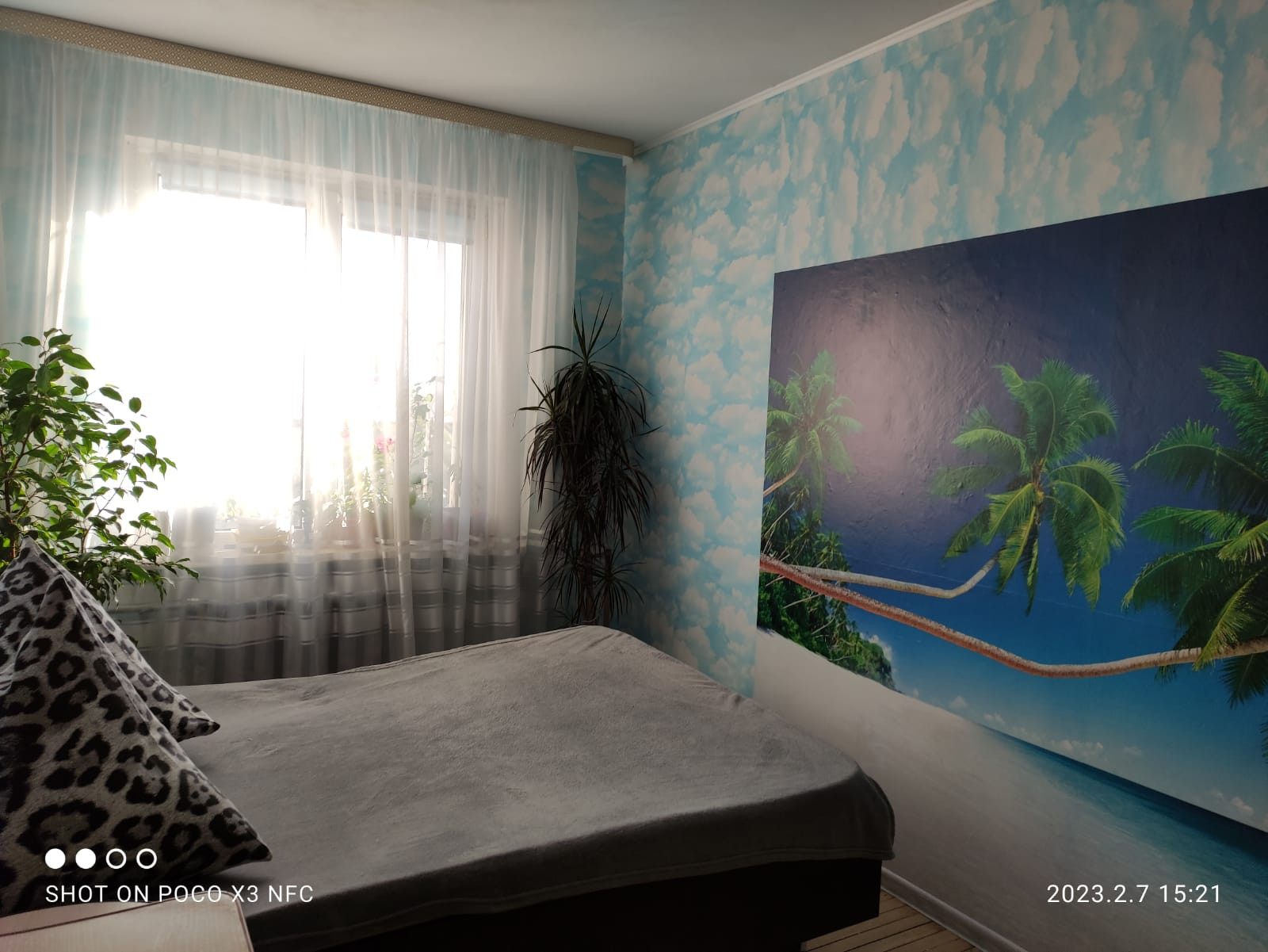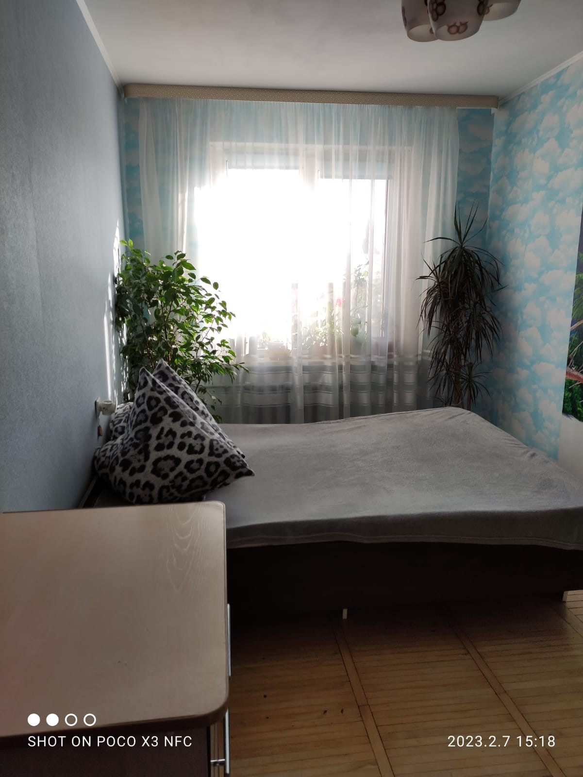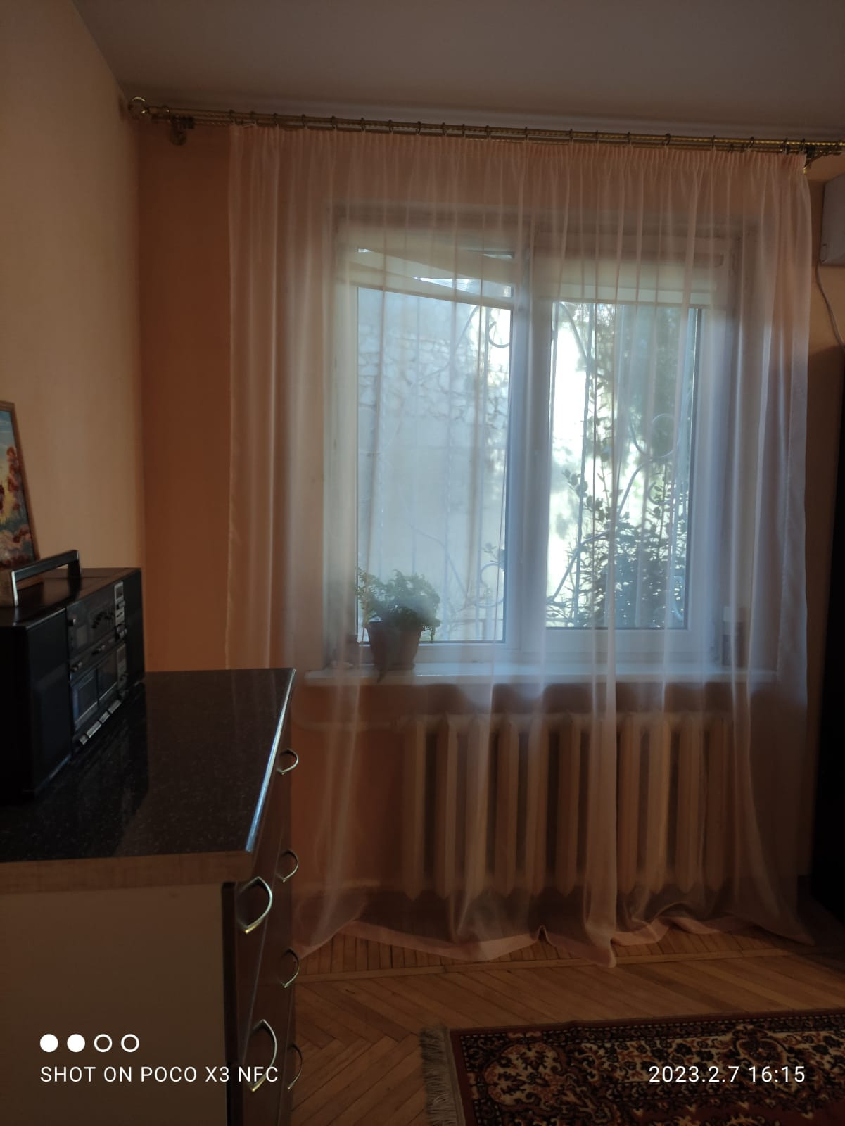 Окна квартиры выходят на солнечную сторону. Двор вокруг утопает в зелени вечнозелёных крымских сосен.