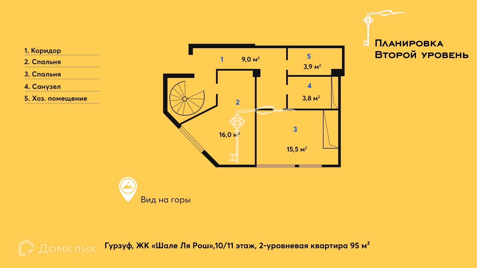 На 2 уровне: две изолированные спальни, санузел, хозяйственное помещение и видовой балкон.
