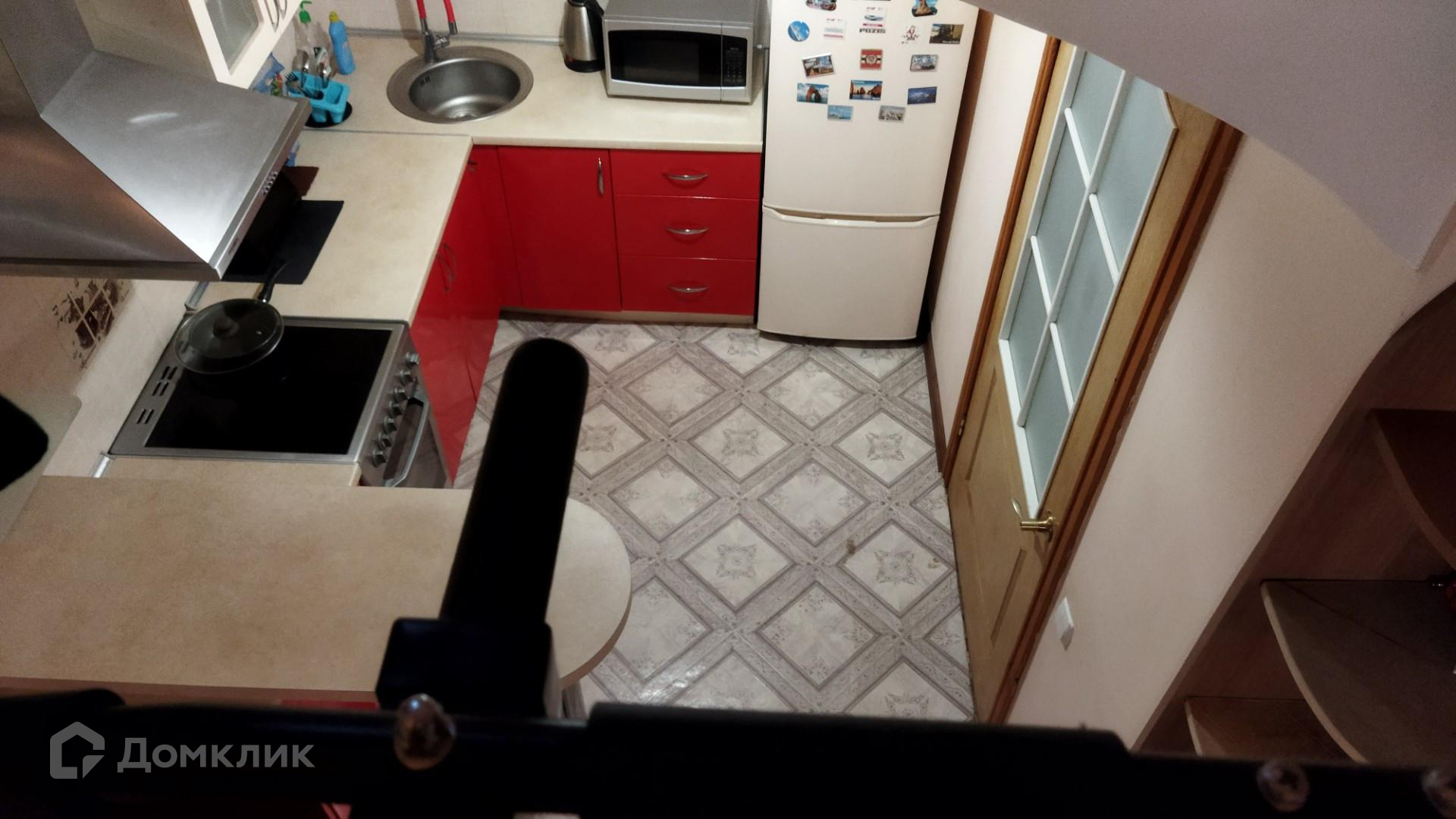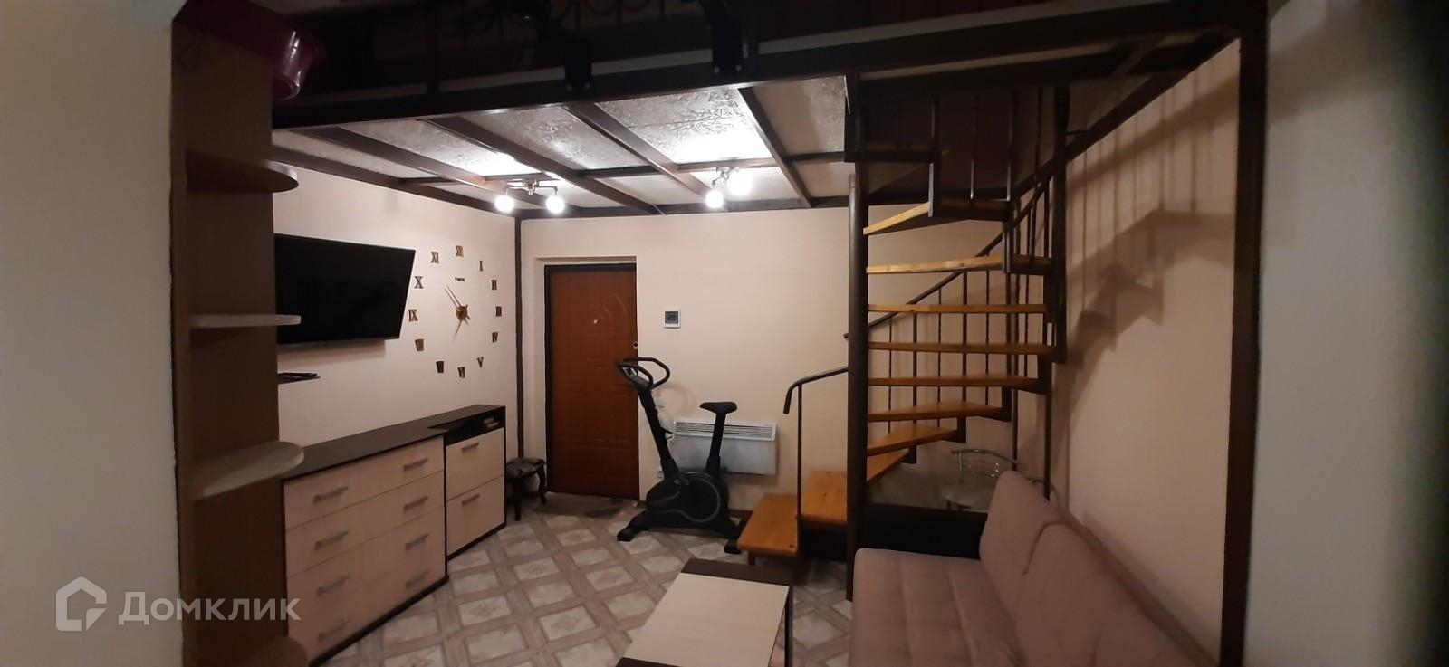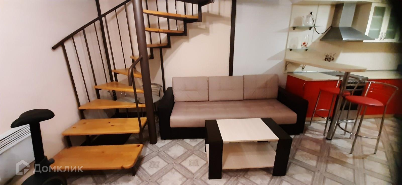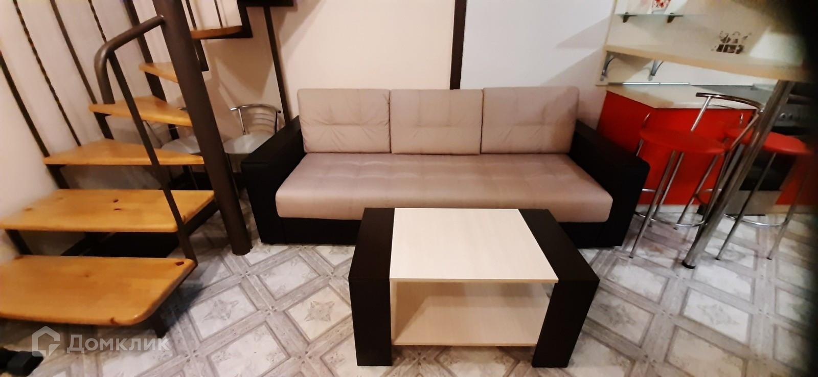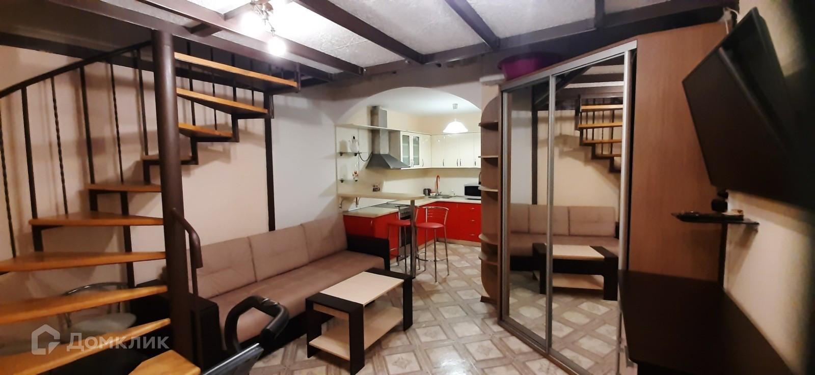 На первом уровне студии гостевая зона и кухня, на втором уровне спальная зона.