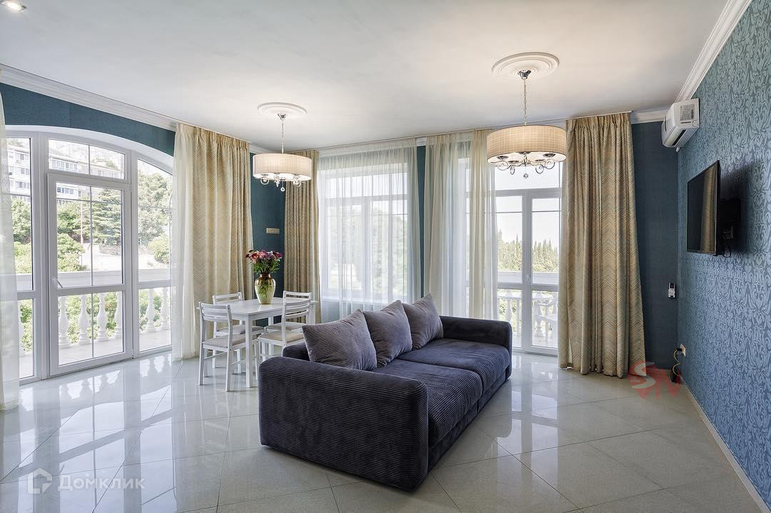 Арт. 52240727 Предлагается на продажу 2-комнатная квартира в новом доме в Крыму в гор. Алупка в 300 метрах от моря!!! Квартира расположена на 6-м этаже 7 этажного здания, общая площадь - 55,9 кв.м.,  Выполнен евроремонт, квартира укомплектована мебелью. Панорамные окна, открытый видовой балкон. В доме есть подземный паркинг  и гостевая стоянка. Статус квартиры. Обслуживание: 38 руб за м2.