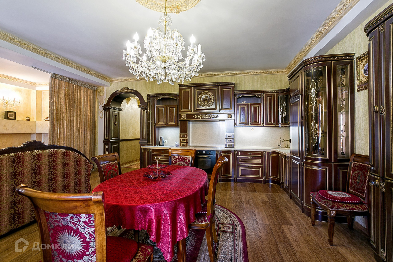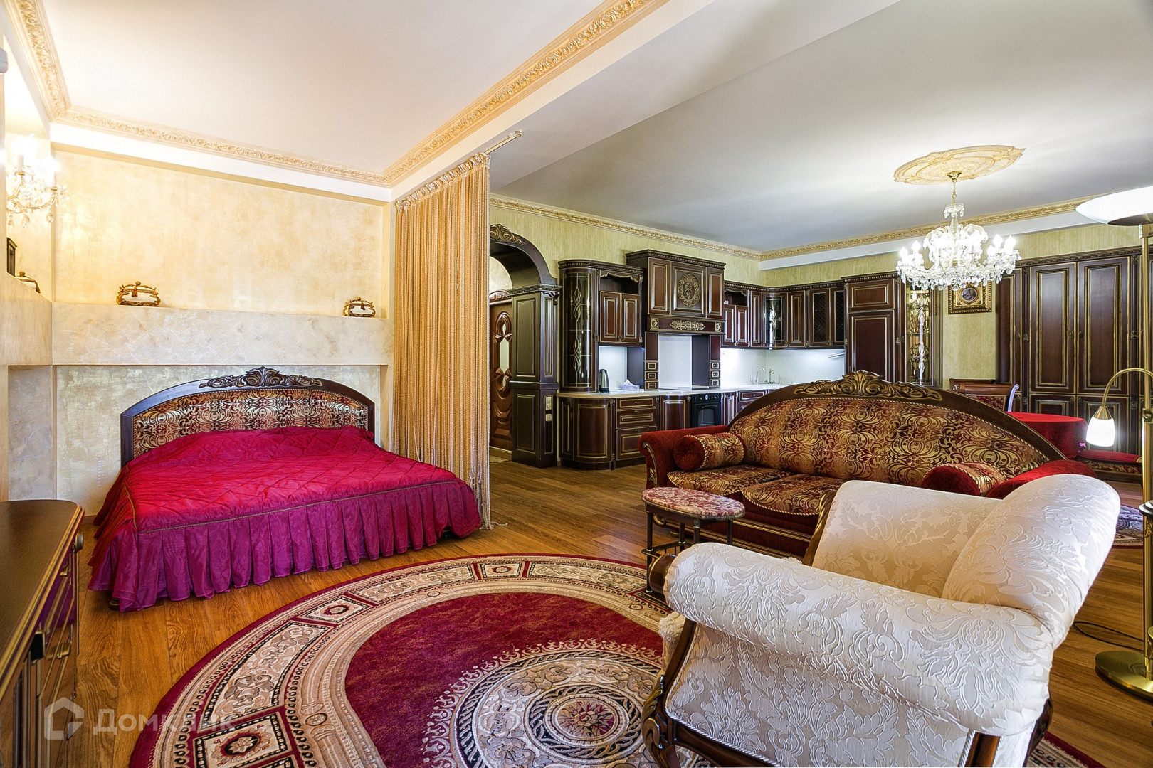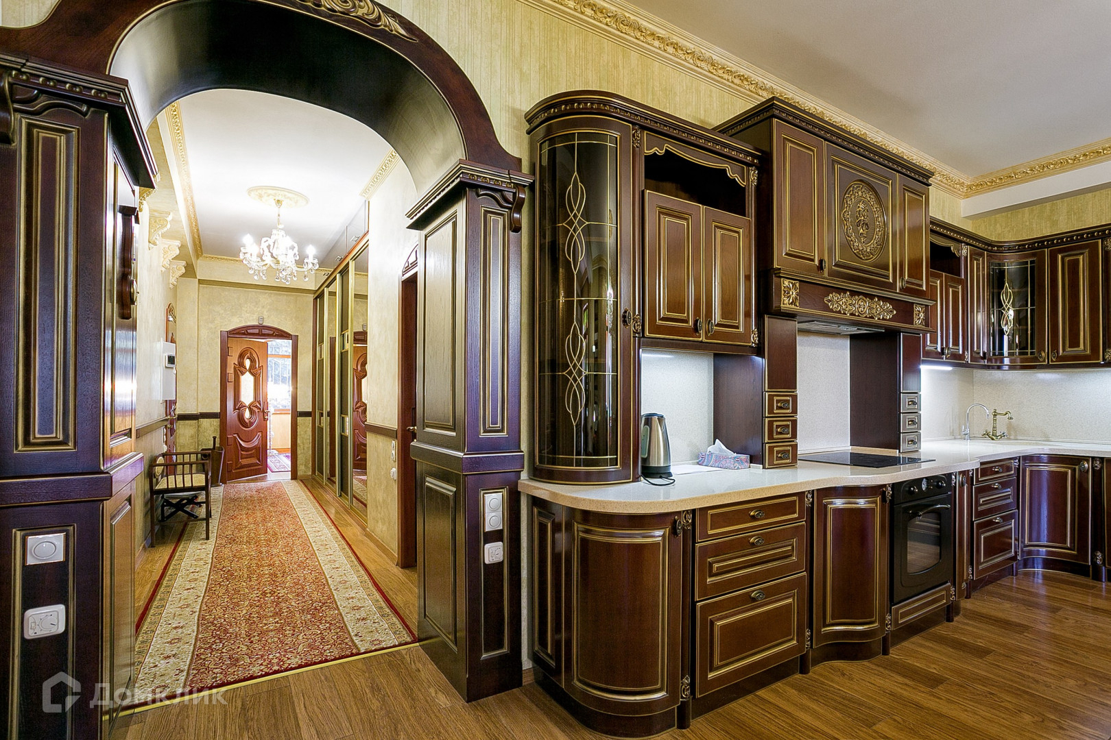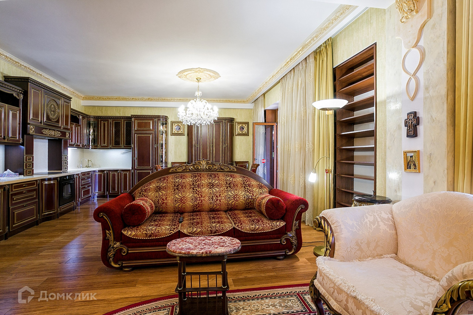 В апартаментах выполнен ремонт в классическом стиле с использованием качественных материалов. На полу выложен паркет из натуральных материалов, стены декорированы Венецианской штукатуркой. Интерьер украшают подвесные люстры с лампами-свечами и длинные шторы из портьерной ткани. Мебель ручной работы из массива дуба. Кухня оборудована с гарнитуром из дерева и бытовой техникой.