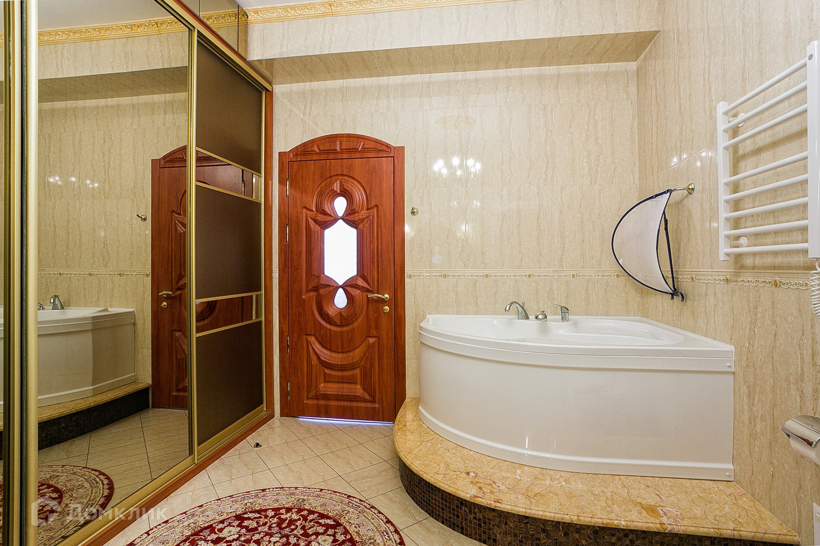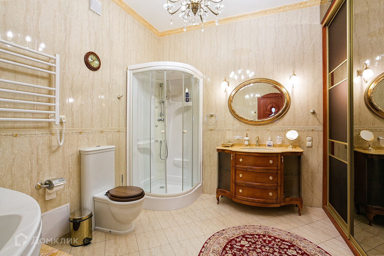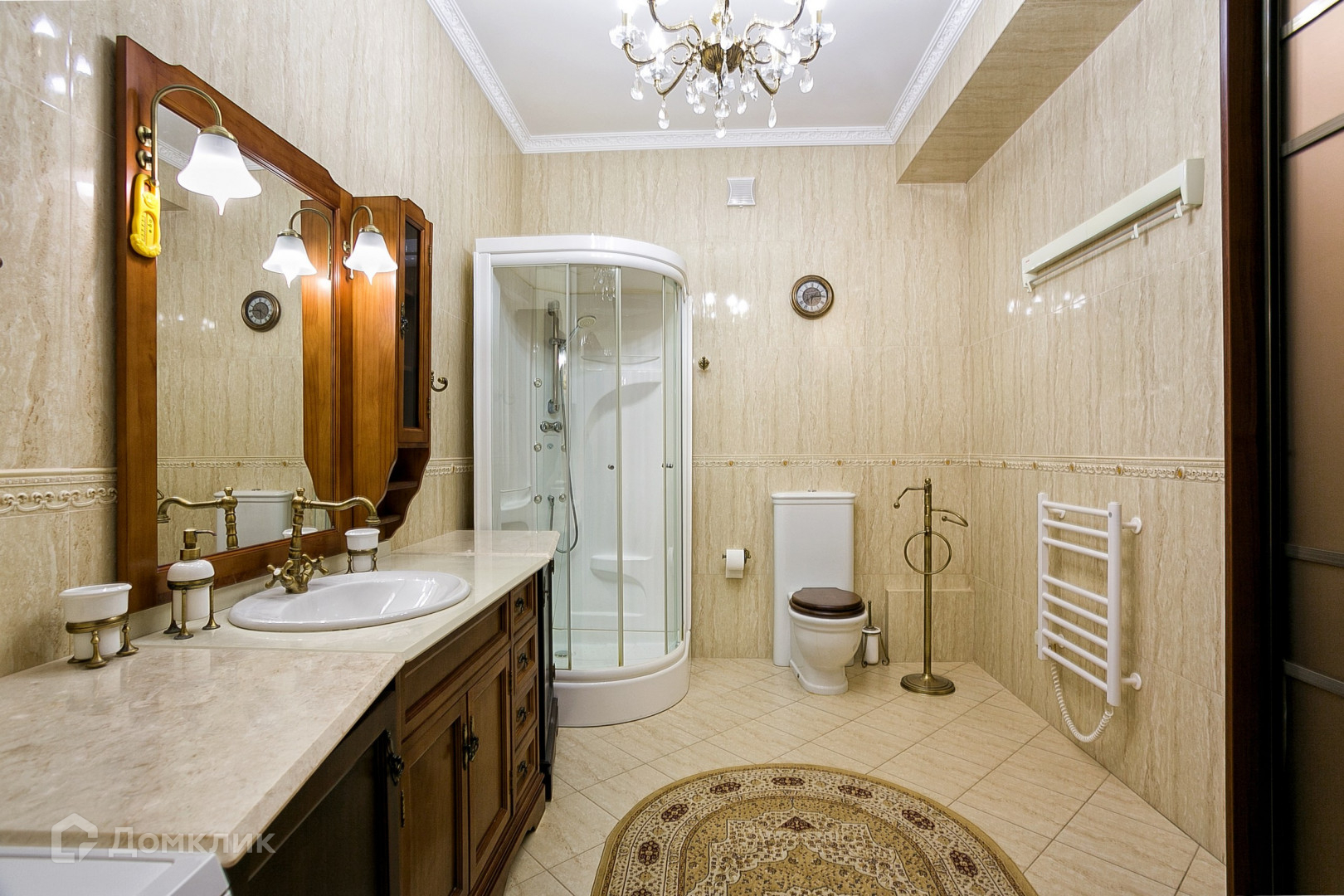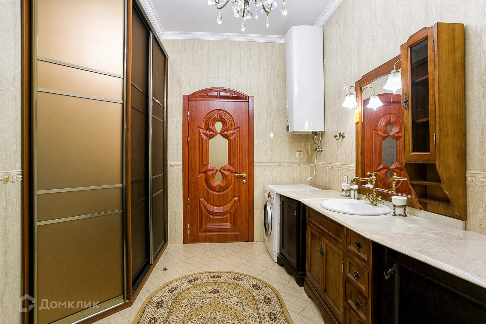 В апартаментах выполнен ремонт в классическом стиле с использованием качественных материалов. На полу выложен паркет из натуральных материалов, стены декорированы Венецианской штукатуркой. Интерьер украшают подвесные люстры с лампами-свечами и длинные шторы из портьерной ткани. Мебель ручной работы из массива дуба. Кухня оборудована с гарнитуром из дерева и бытовой техникой.
