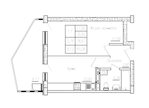 • Общая площадь 38,67 м2