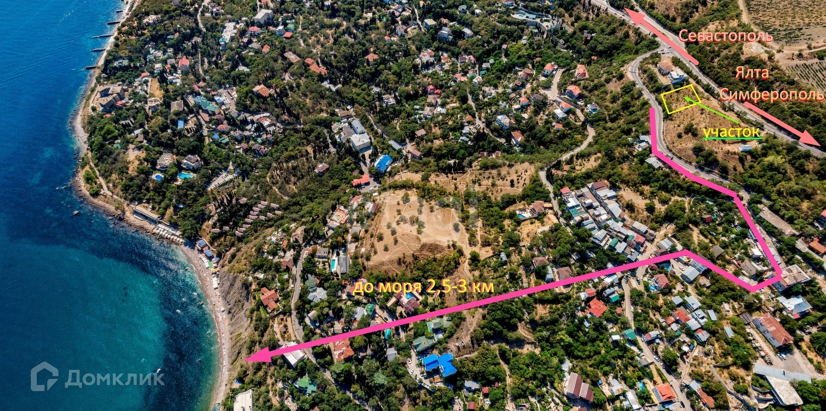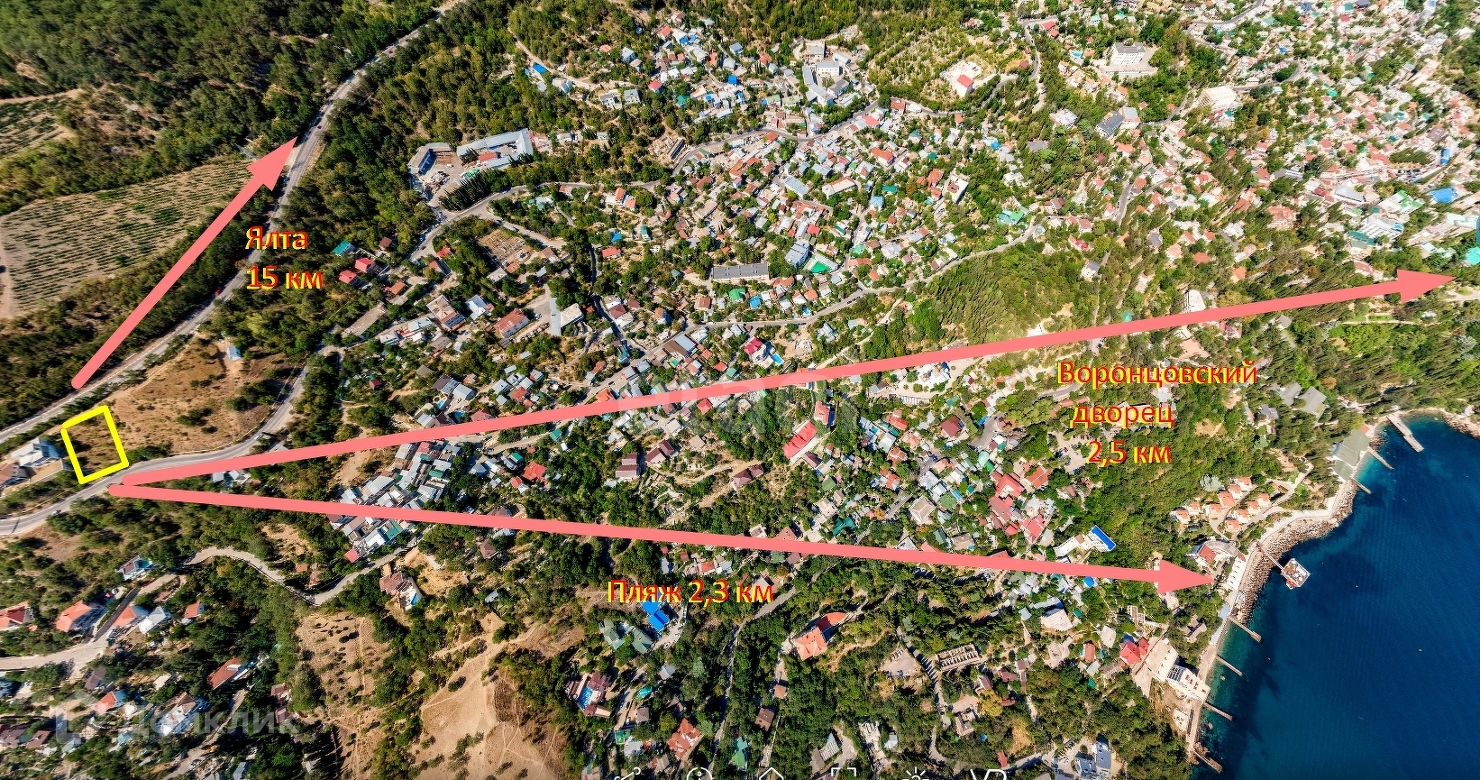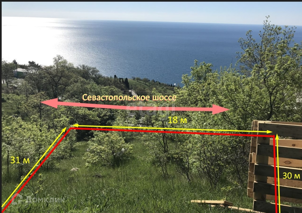 На участке небольшое количество деревьев и кустарников. Вода заведена на участок. Электричество и газ идут по нижней границе участка. Расстояние от нижней границы участка 3 метра до Севастопольского шоссе (асфальтированная дорога), откуда можно сделать заезд. Расстояние от верхней границы до Южнобережного шоссе 30 метров, откуда имеется также заезд по грунтовой дороге.