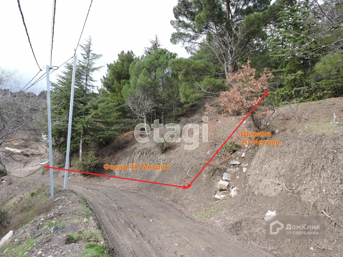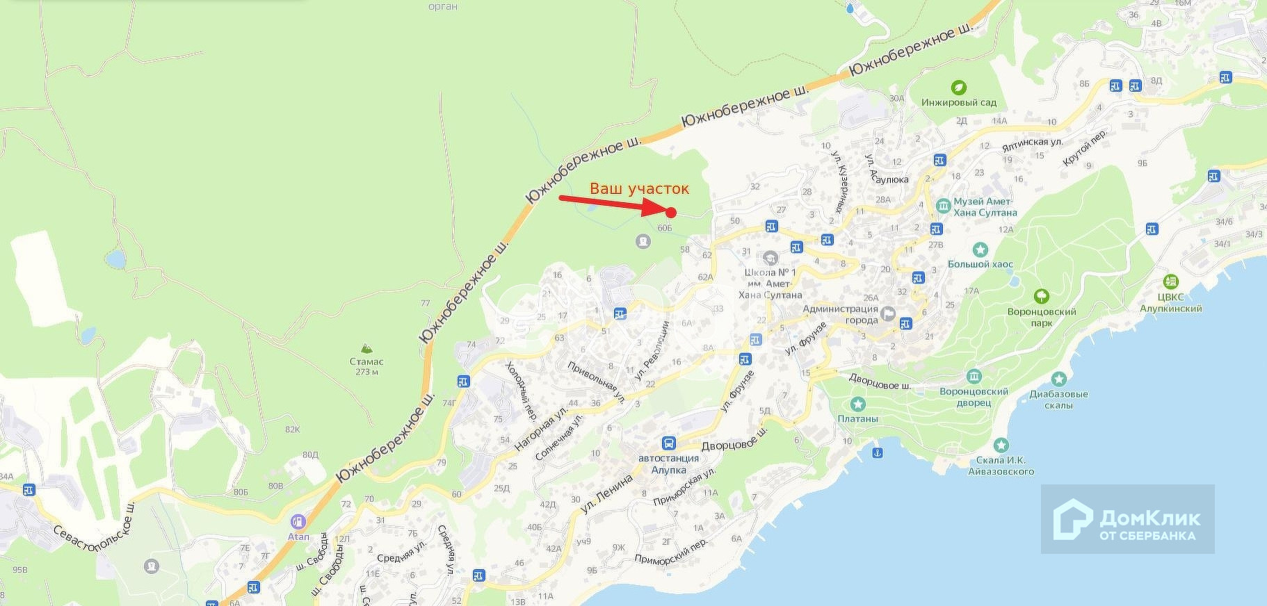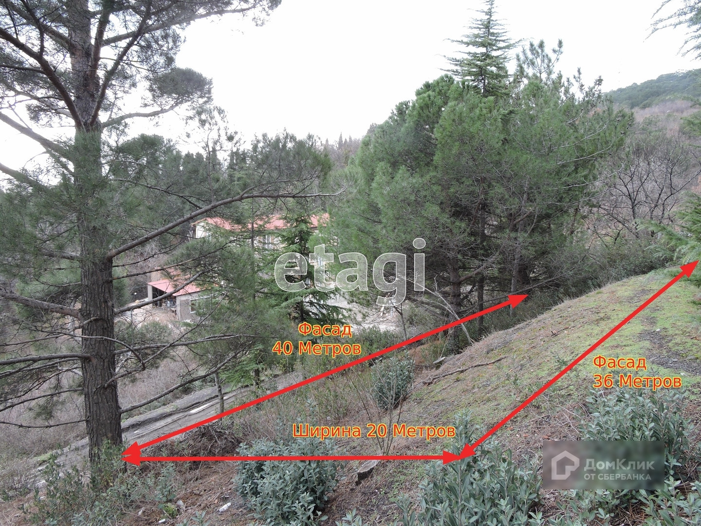 Участок имеет склон, что дает участку прекрасный вид на море, и который никто не застроит в будущем. На участке прорастают хвойные деревья и граничит с лесным массивом.