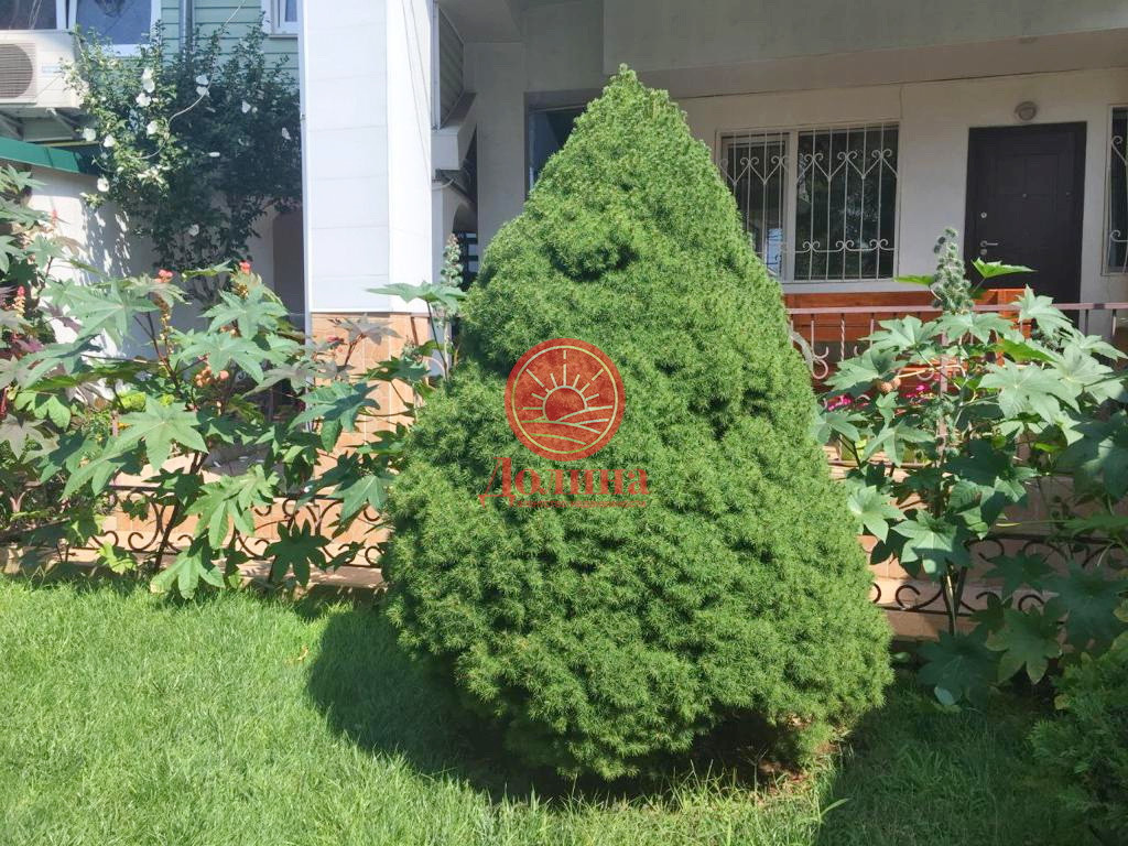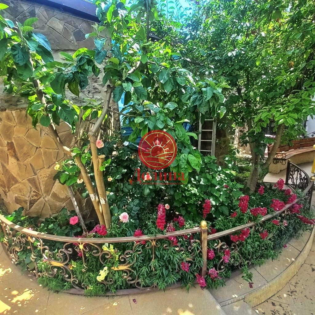 Ухоженный, красивый двор, с огромным количеством зелени, начиная от газонов с цветами, заканчивая плодоносящими фруктовыми деревьями, с выделенными зонами отдыха, барбекю.