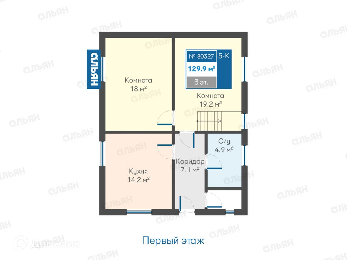 1 этаж: комната 18 м2 и 19,2 м2, санузел 4,9 м2, кухня 14,2 м2, коридор 7,1 м2.