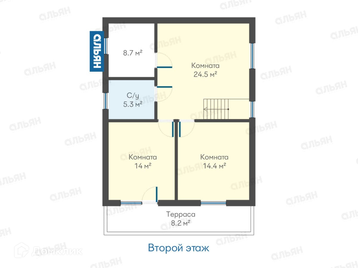2 этаж: комната 14 м2, комната 14,4 м2 и 24,5 м2, санузел 5,3 м2, выход на террасу 8,2 м2.
