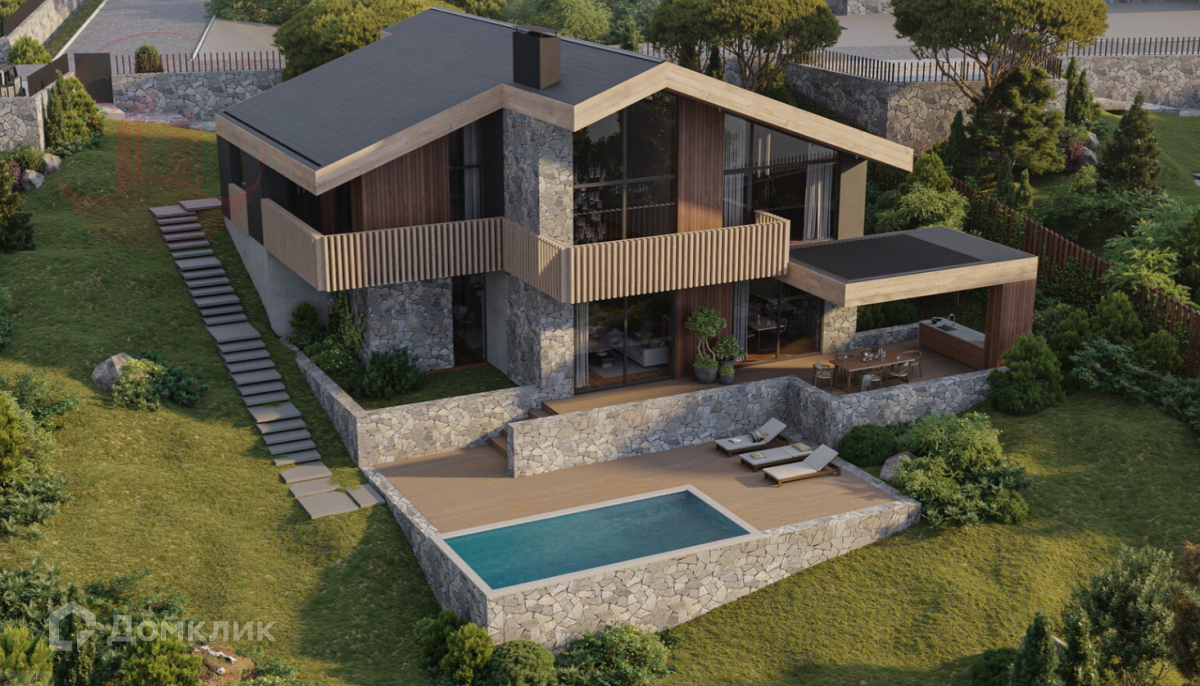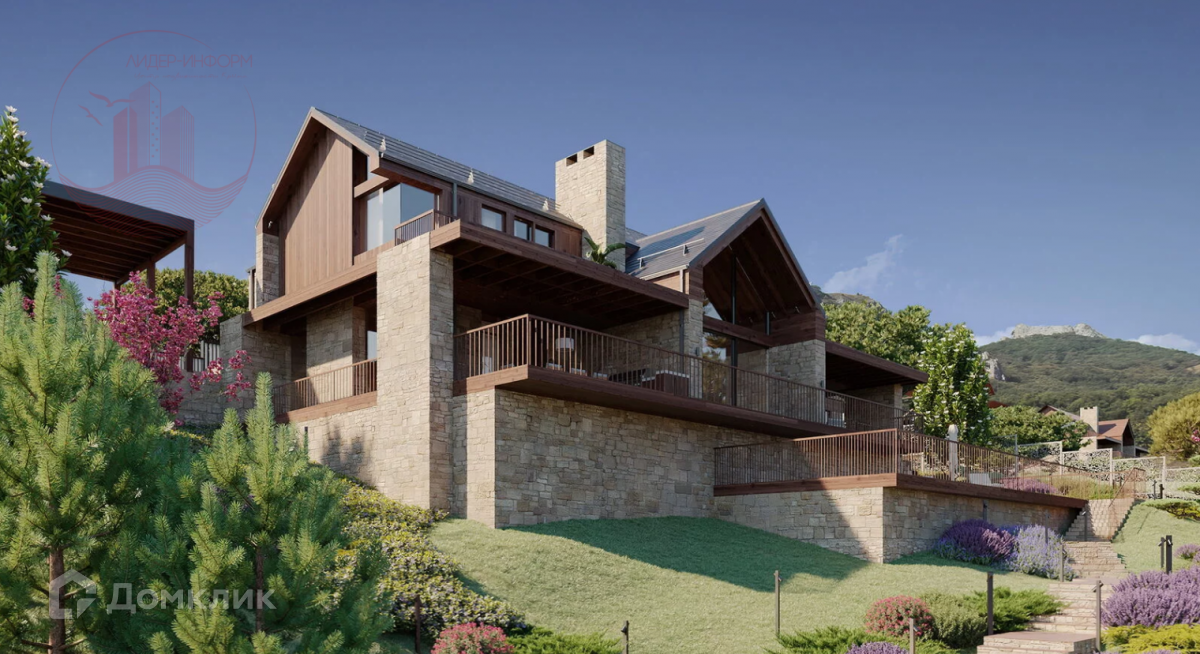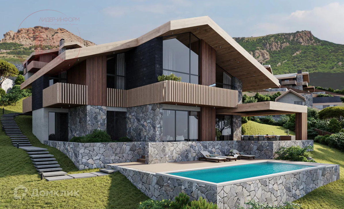 Просторные коттеджи с панорамным остеклением органично вписаны в горную местность благодаря отделке из натурального камня и дерева.