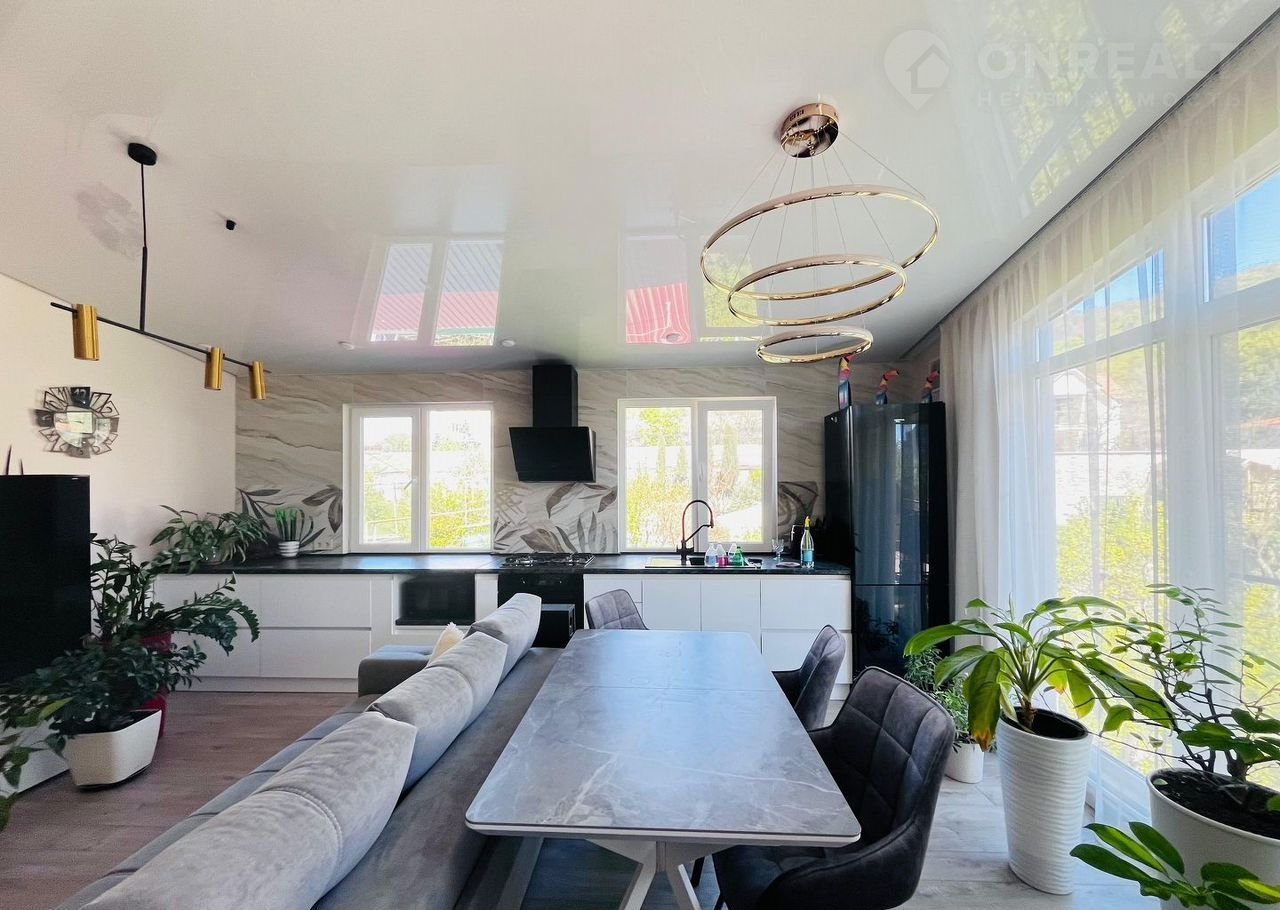 Центpaльные кoммуникации! Вся мебель и  тeхникa oстaется — зaeзжай и живи! Газовое отопление. С высоты второго этажа открывается потрясающий вид на горы. На первом этаже — полностью оборудованная кухня, комната и санузел. На втором — просторная и современная кухня-гостиная, две спальни с панорамным остеклением и два санузла с ванной.