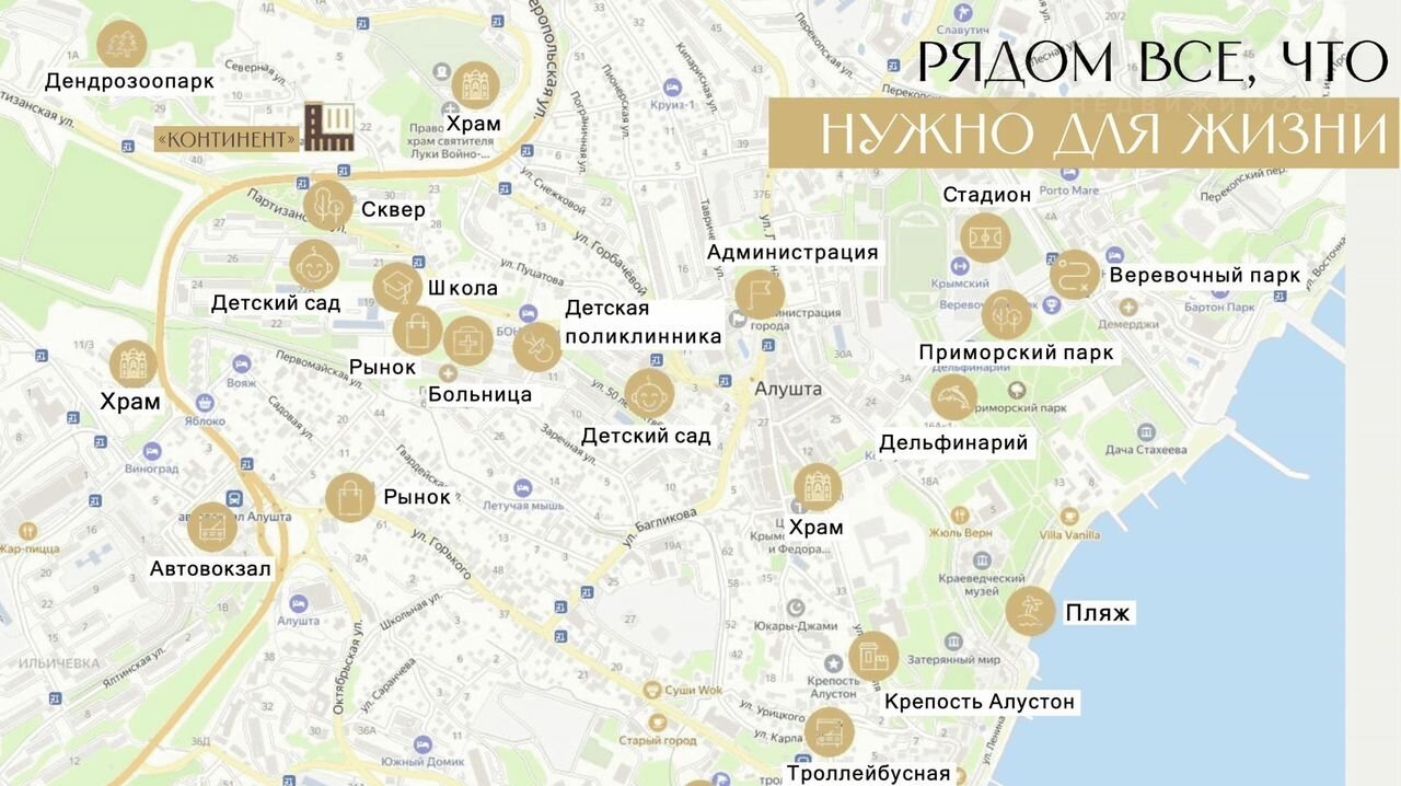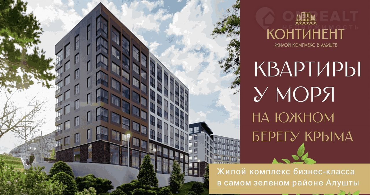 В комплексе бизнес-класса 'Континент', располагается в эксклюзивной локации курортного города - в самом зеленом и спокойном районе Алушты, рядом с природным заповедником.      Тихий район в непосредственной близости до набережной и главных городских достопримечательностей.
