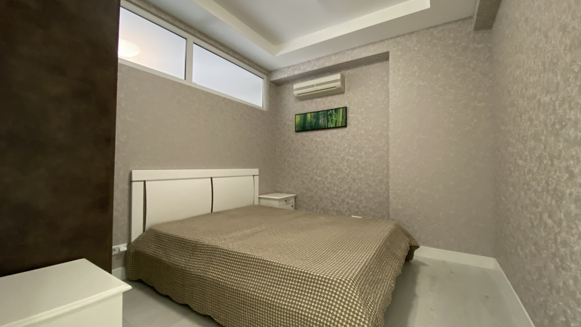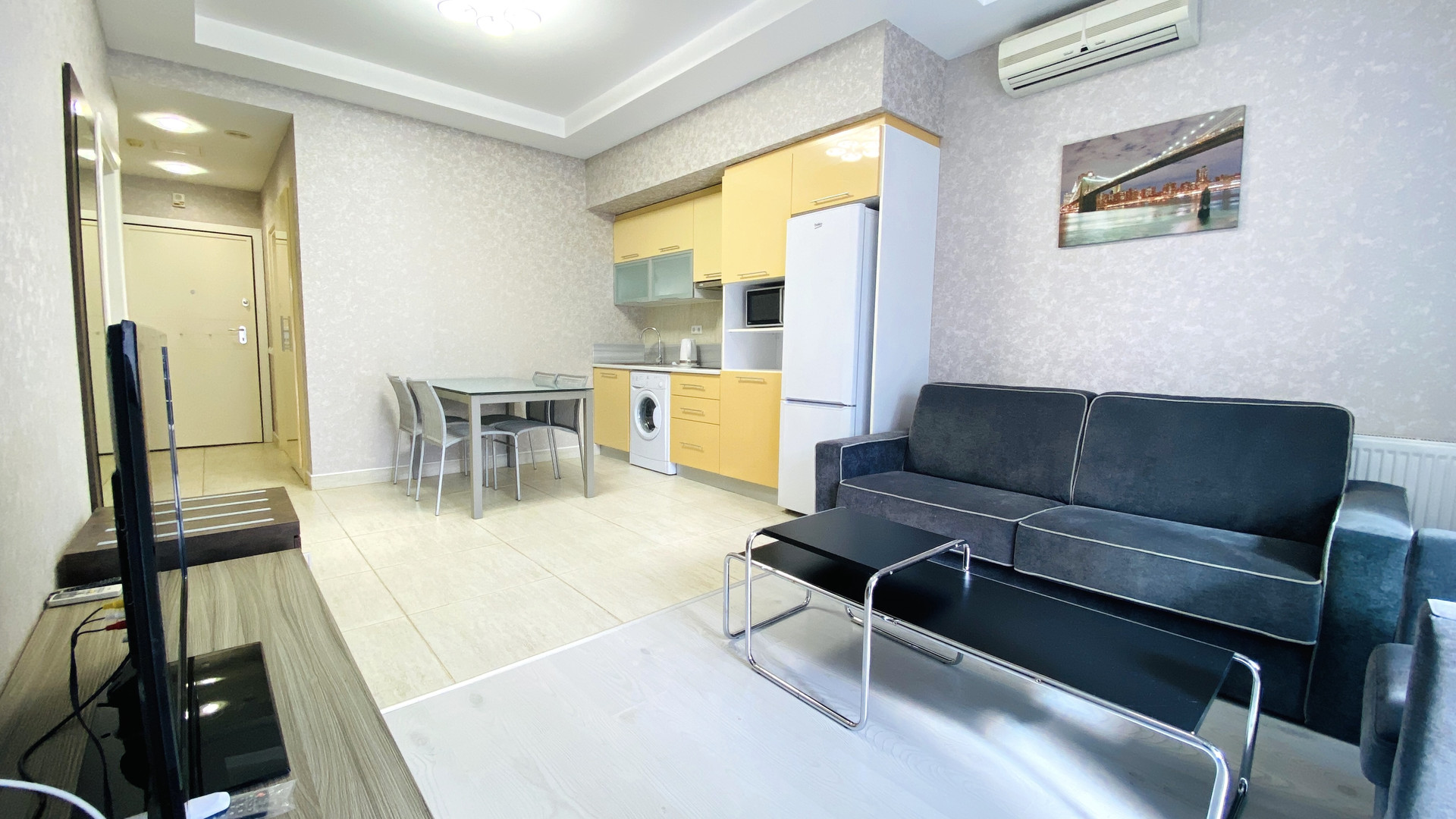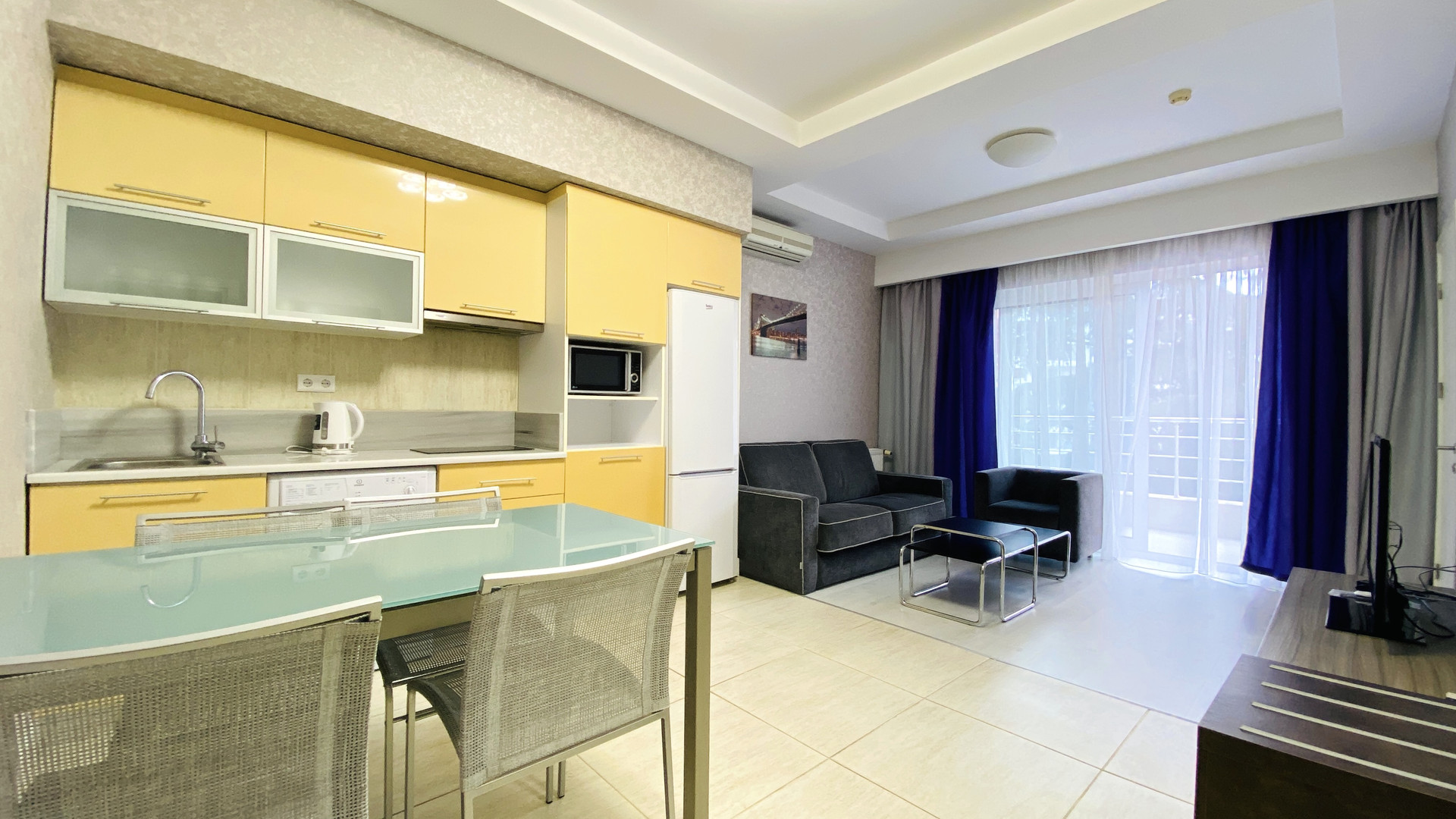В апартаментах умело оборудованная кухня с встроенной мебелью, техникой и обеденной зоной, а также установлено три кондиционера.