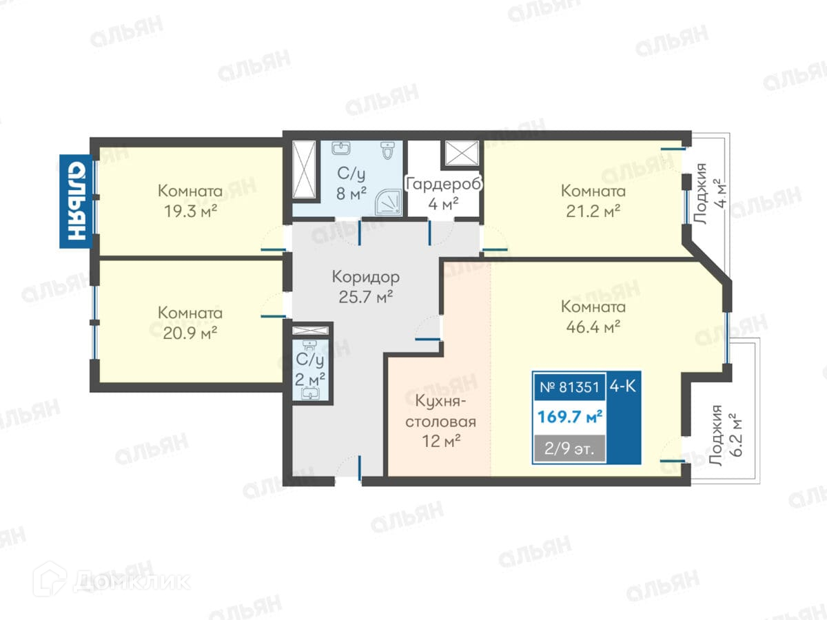 Кухня-столовая 12 м2, санузел 2 м2 и санузел 8 м2, коридор 25,7 м2 комната 20,9 м2, комната 19,3 м2, гардероб 4 м2, комната 21,2 м2, комната 46,4 м2,  лоджия 4 м2, лоджия 6,2 м2.