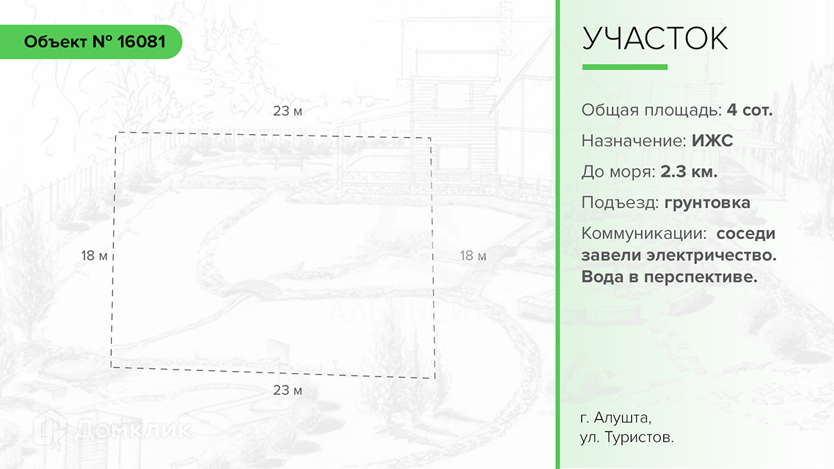 Продается участок в городе Алушта, улица Туристов. Общая площадь участка: 4 сотки. Назначение: индивидуальное жилищное строительство.