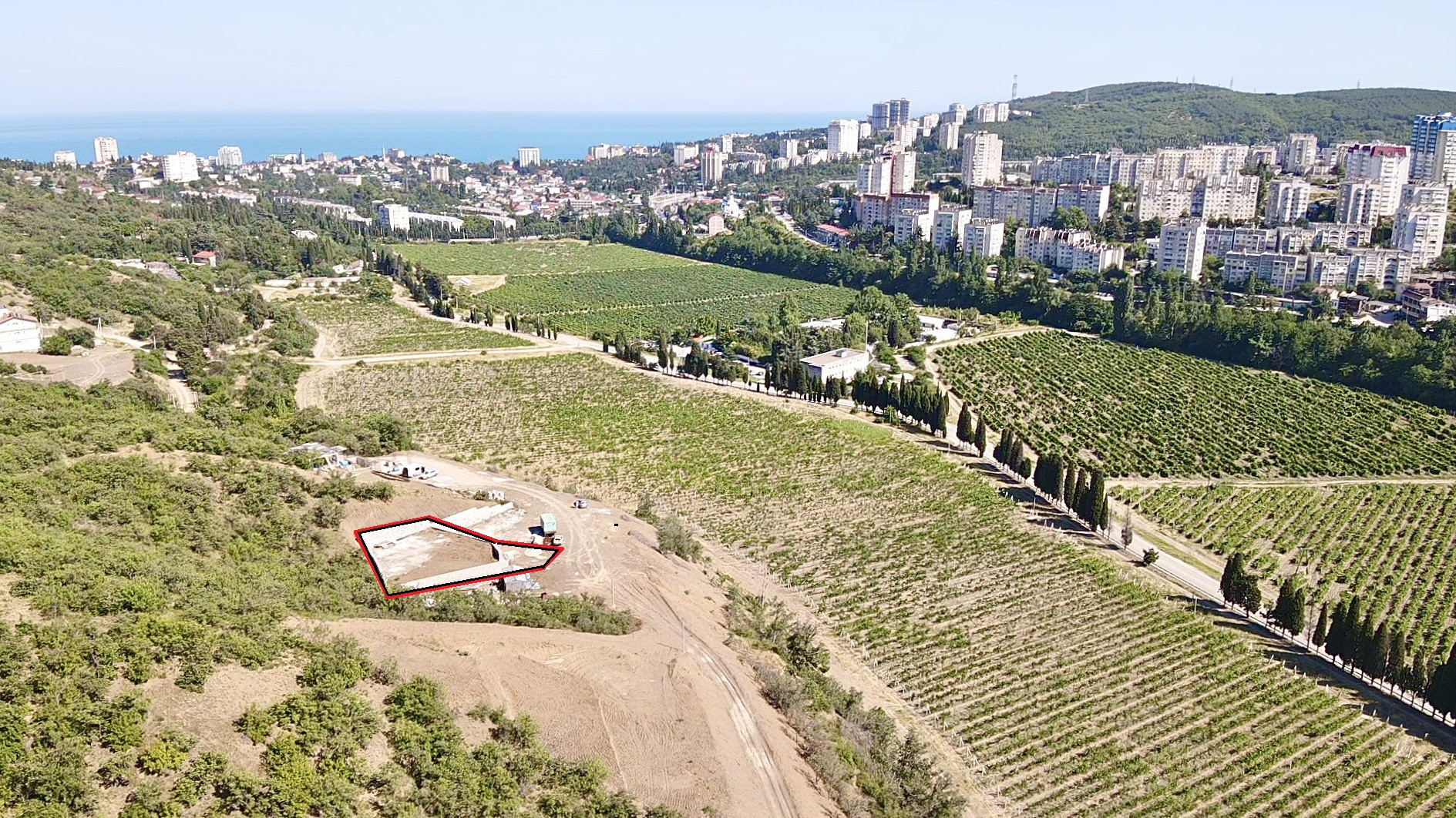 С участка открываются красивые виды на море, горы, виноградники.