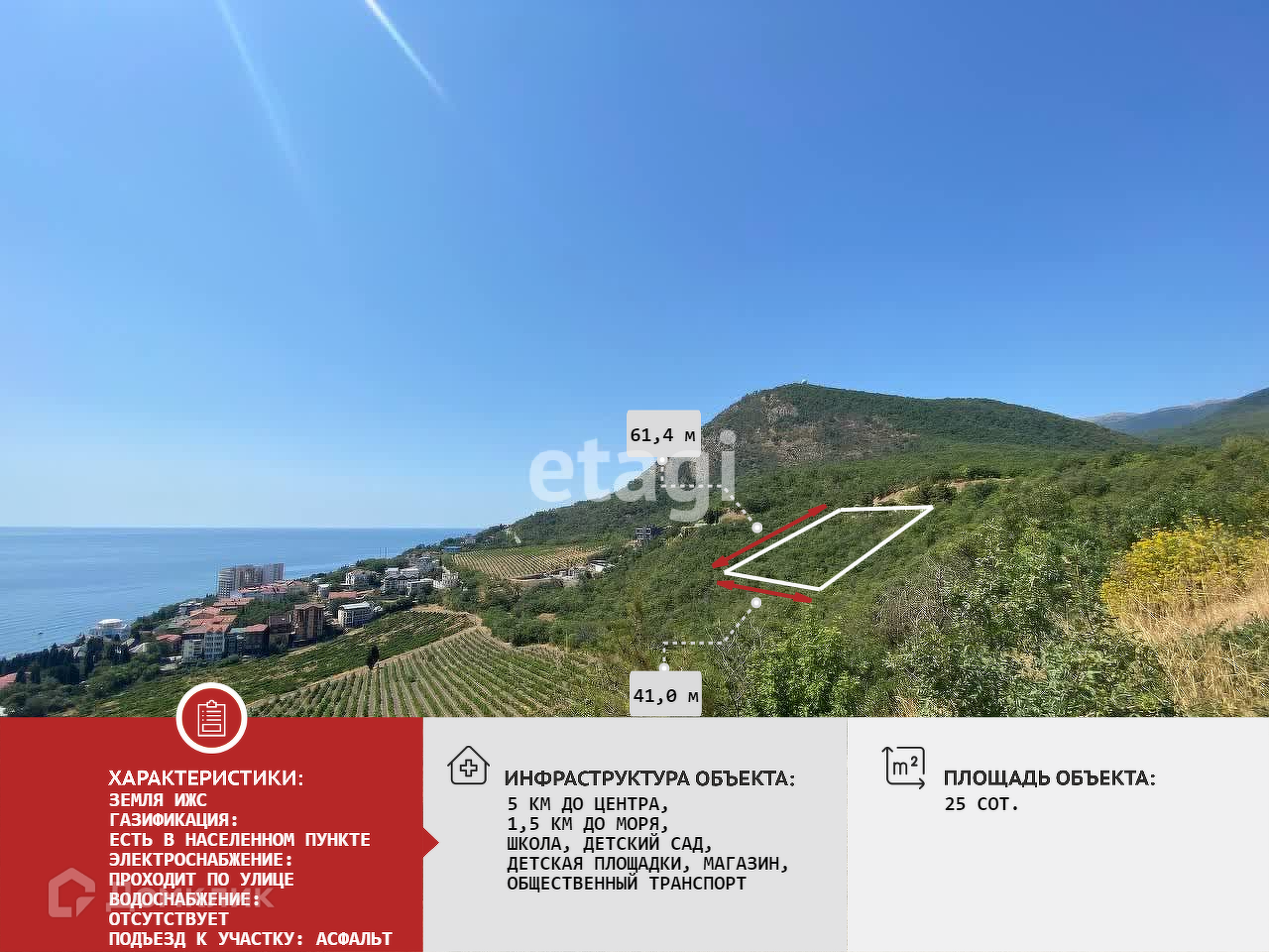 Участок ИЖС, 25 соток, правильной формы, находится на возвышенности в активно застраивающемся районе с шикарными видами на море и горы.