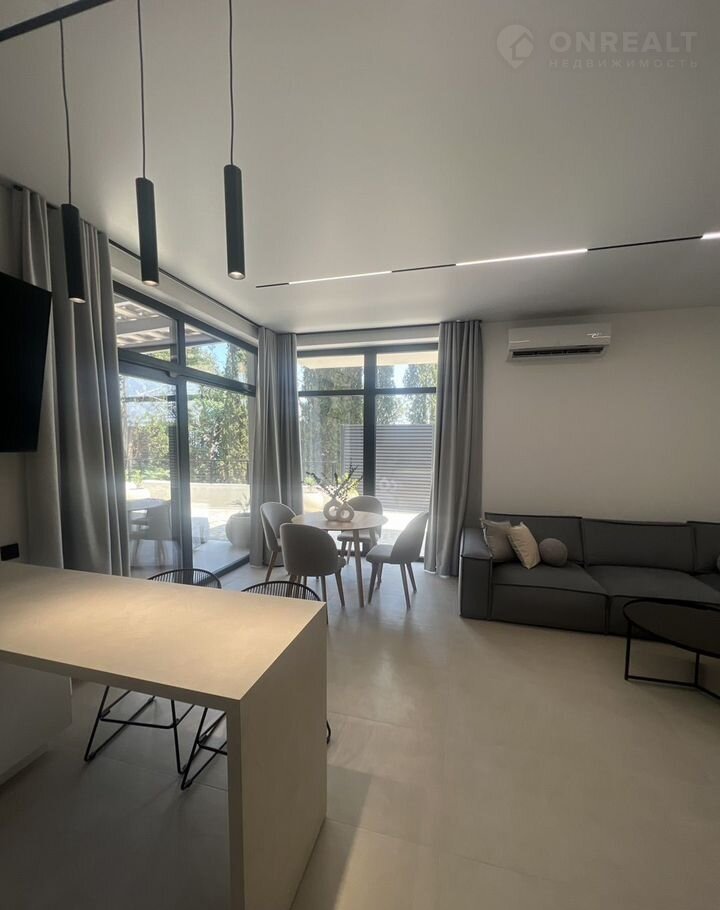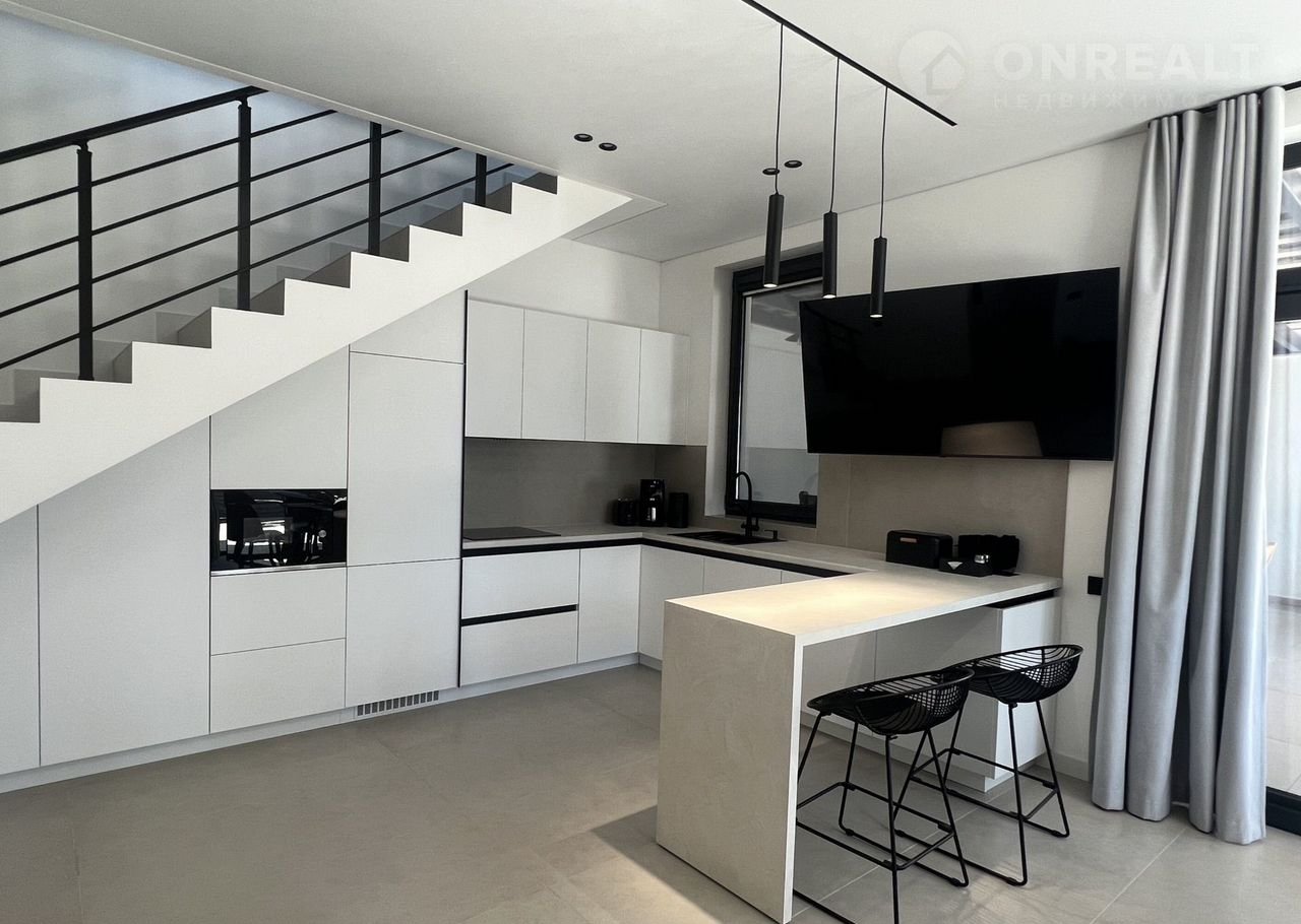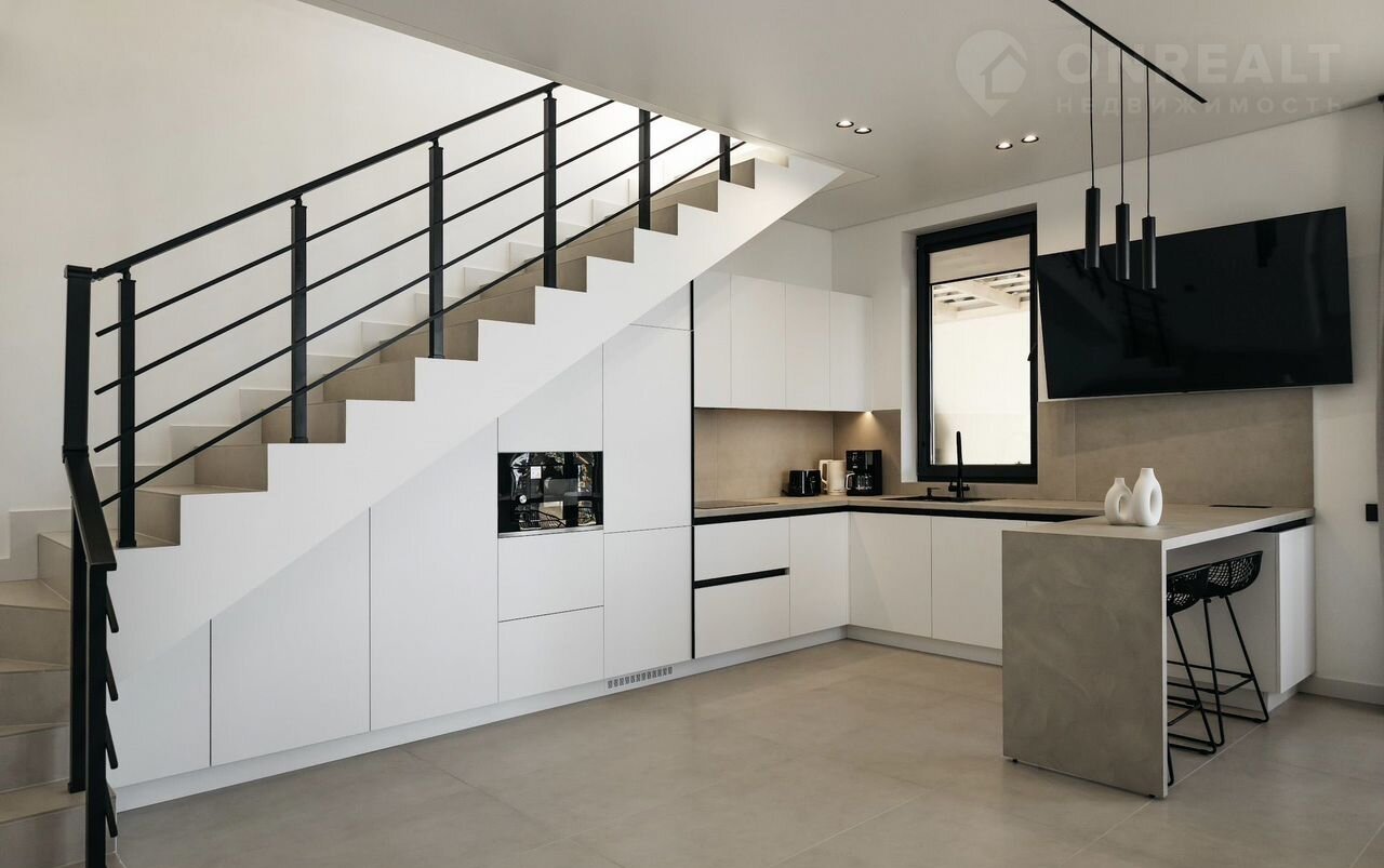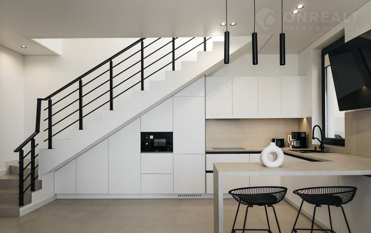 - из кухни-студии - выход на большую террасу с потрясающим видом на море, где размещена обеденная мебель на 8 посадочных мест, стол, мангал, два мягких шезлонга, две качели.