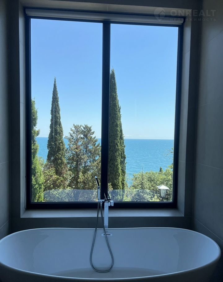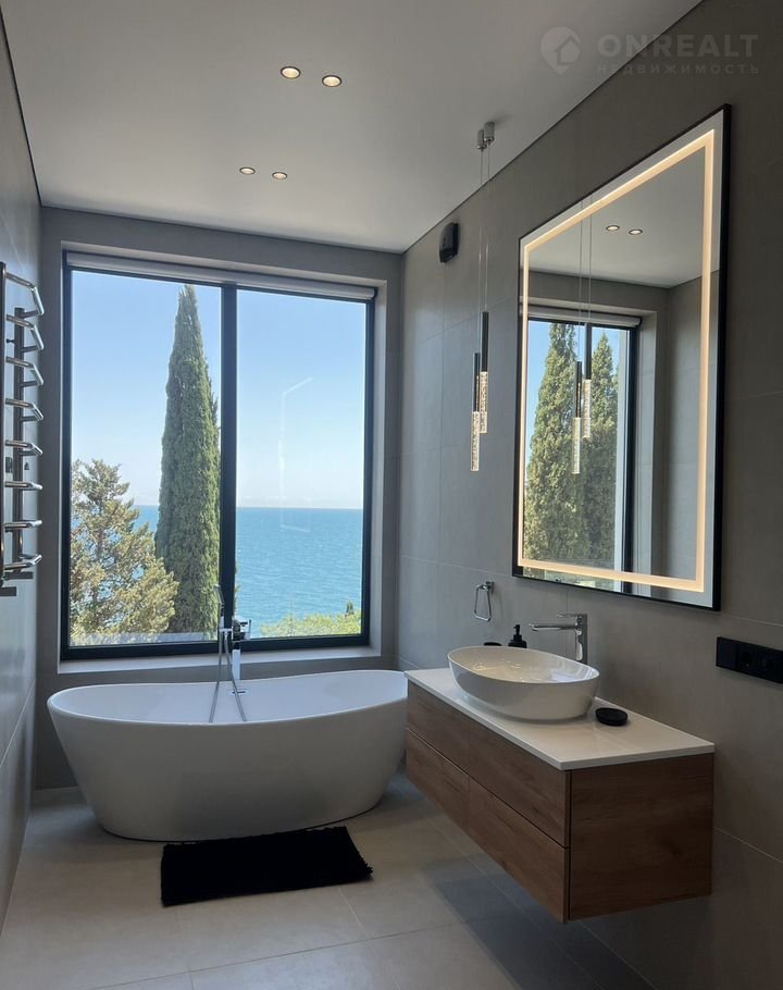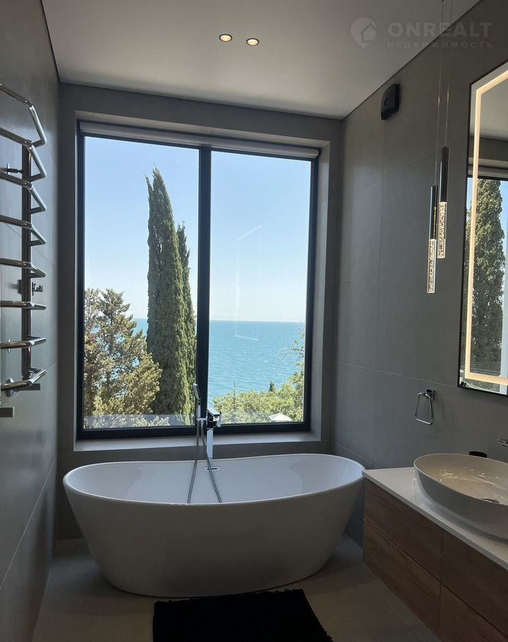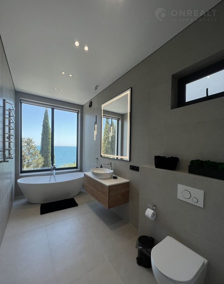 - ванная комната с панорамным видом на море, ванная, с/у и другие необходимые атрибуты.