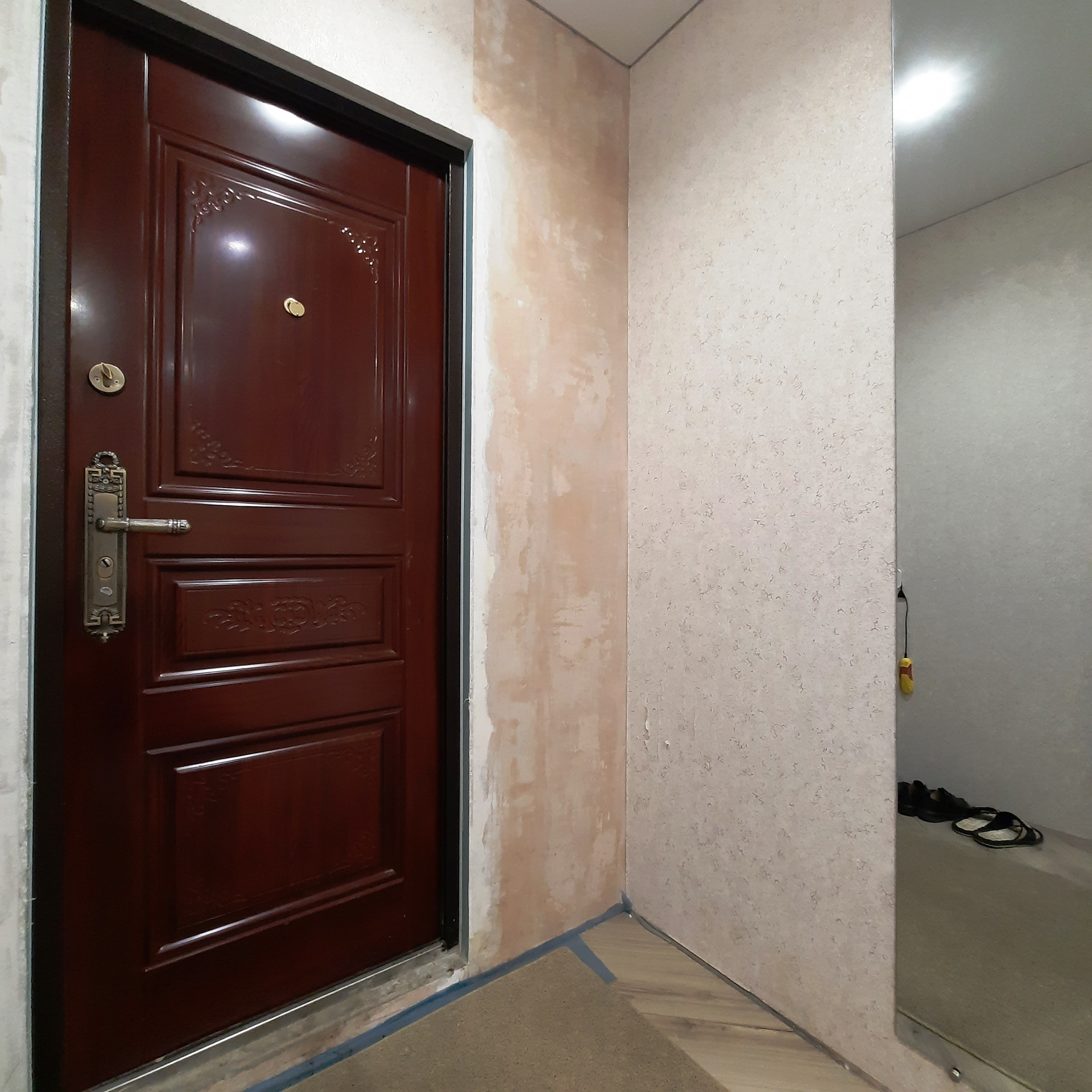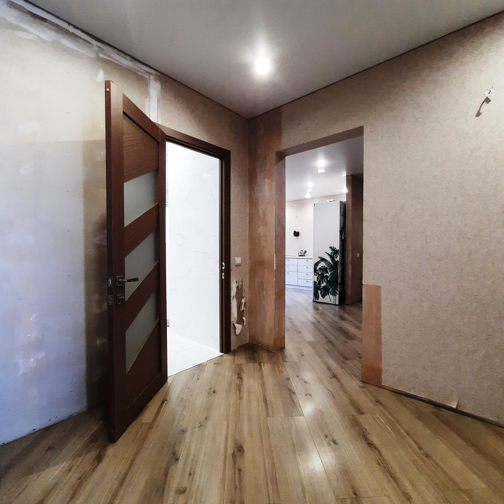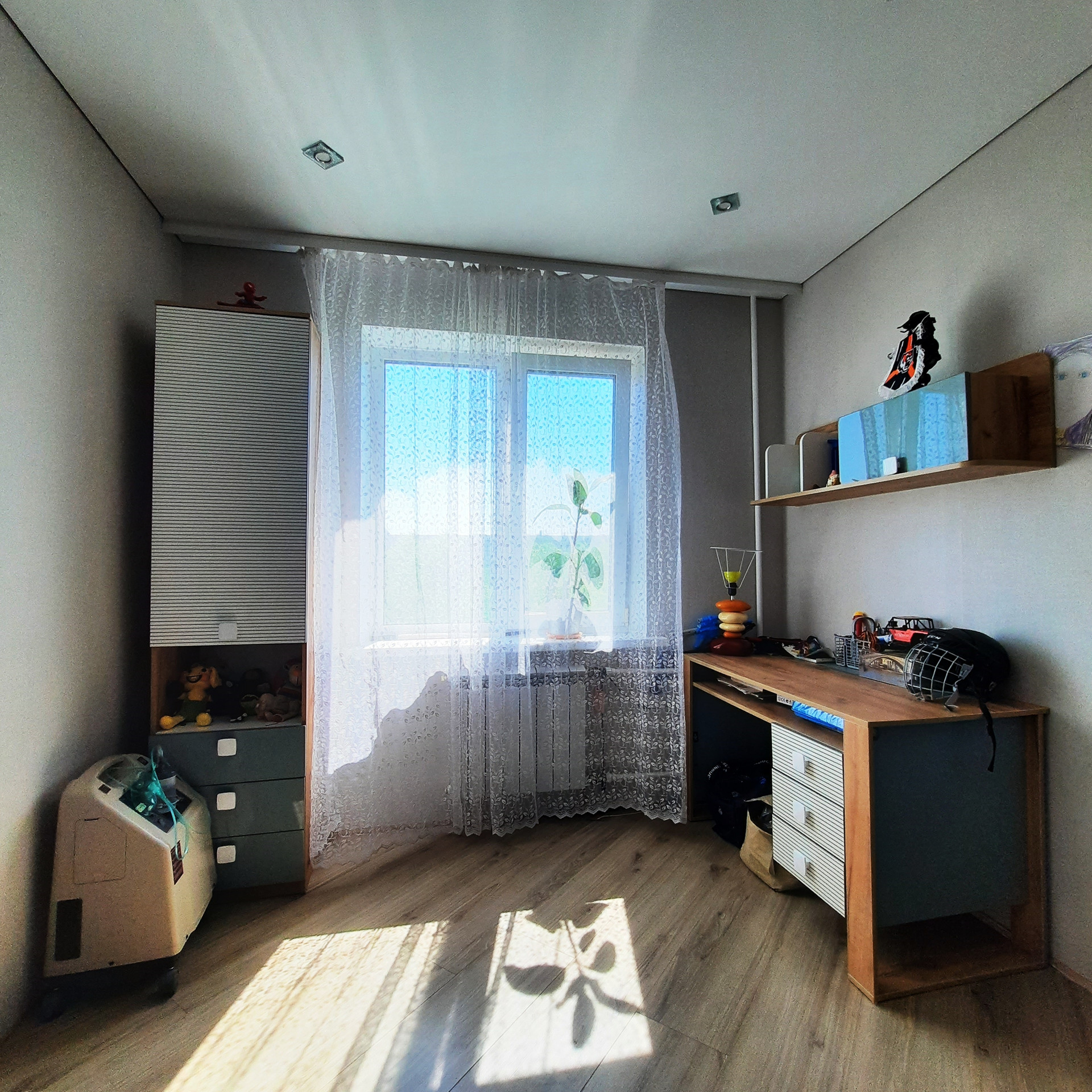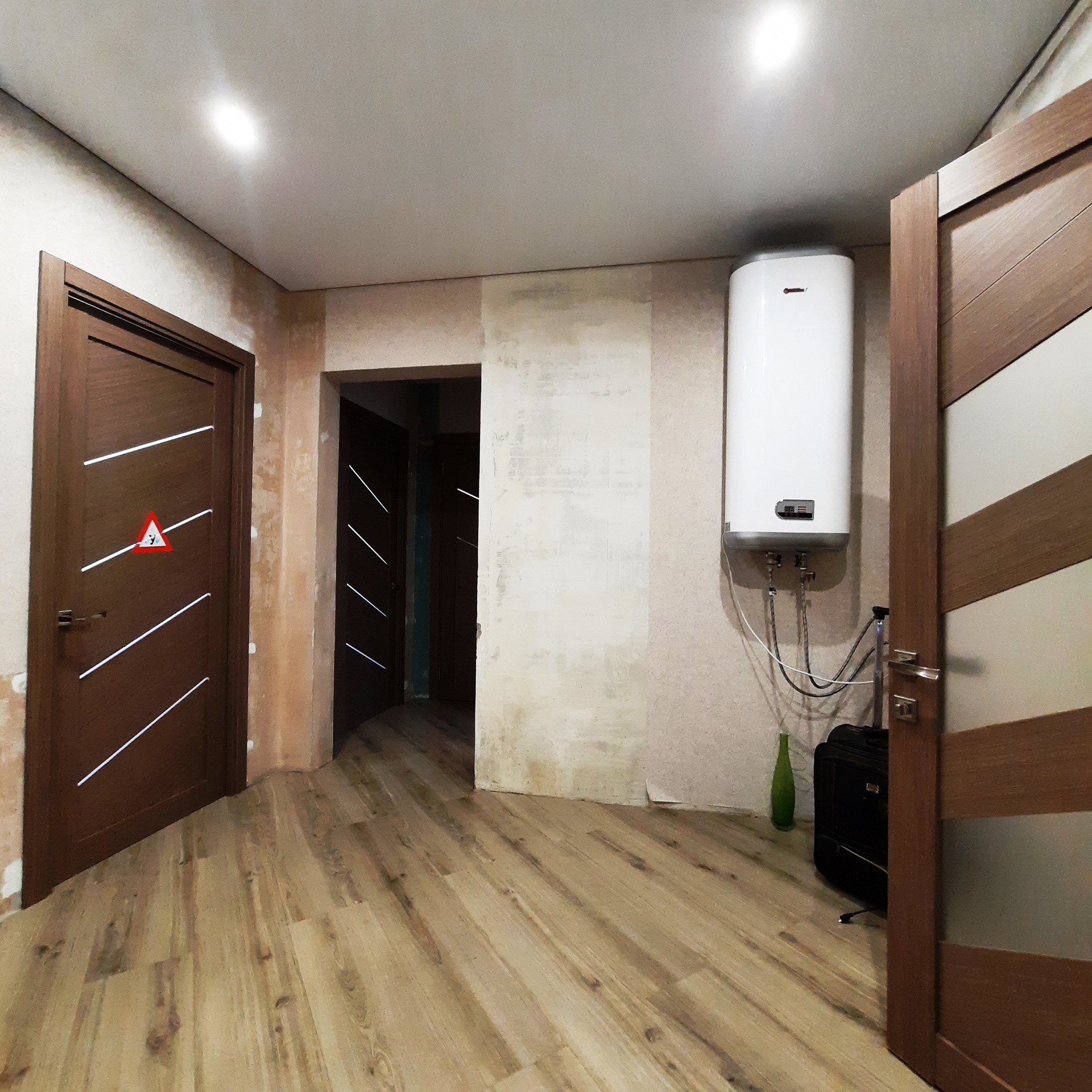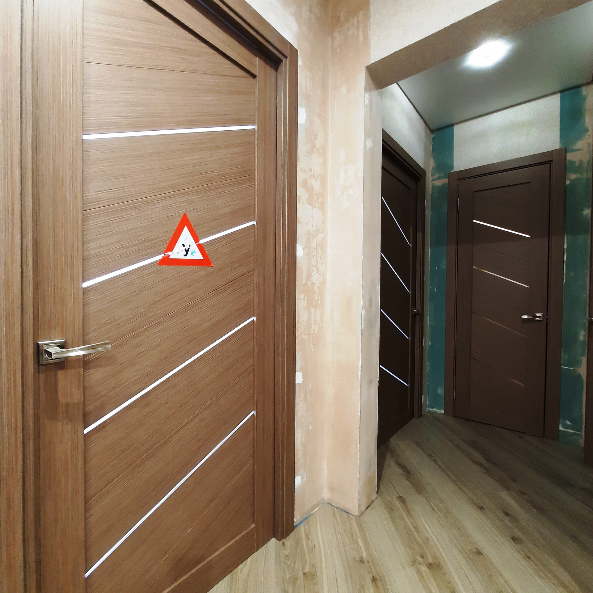 По всей квартире выровнены стены и произведена стяжка полов, уложен качественный ламинат, «тёплые полы» в прихожей и двух детских комнатах, дорогой кафель в санузле (Вам стоит посмотреть отделку «вживую»), новая сантехника и электропроводка, новые радиаторы отопления, натяжные потолки (сатин), новые межкомнатные двери, окна пластик, балкон застеклён (с внутренней отделкой).