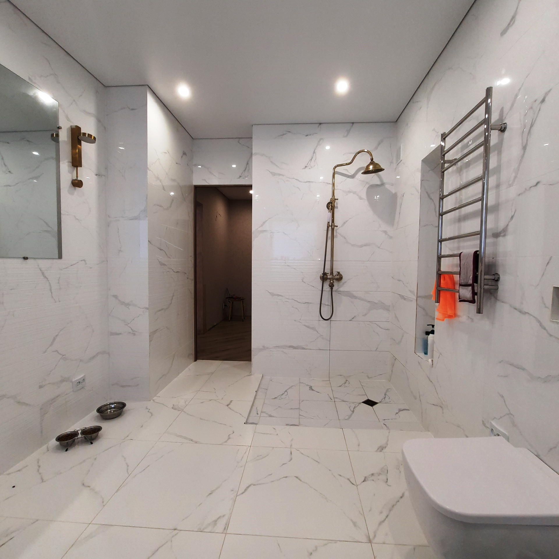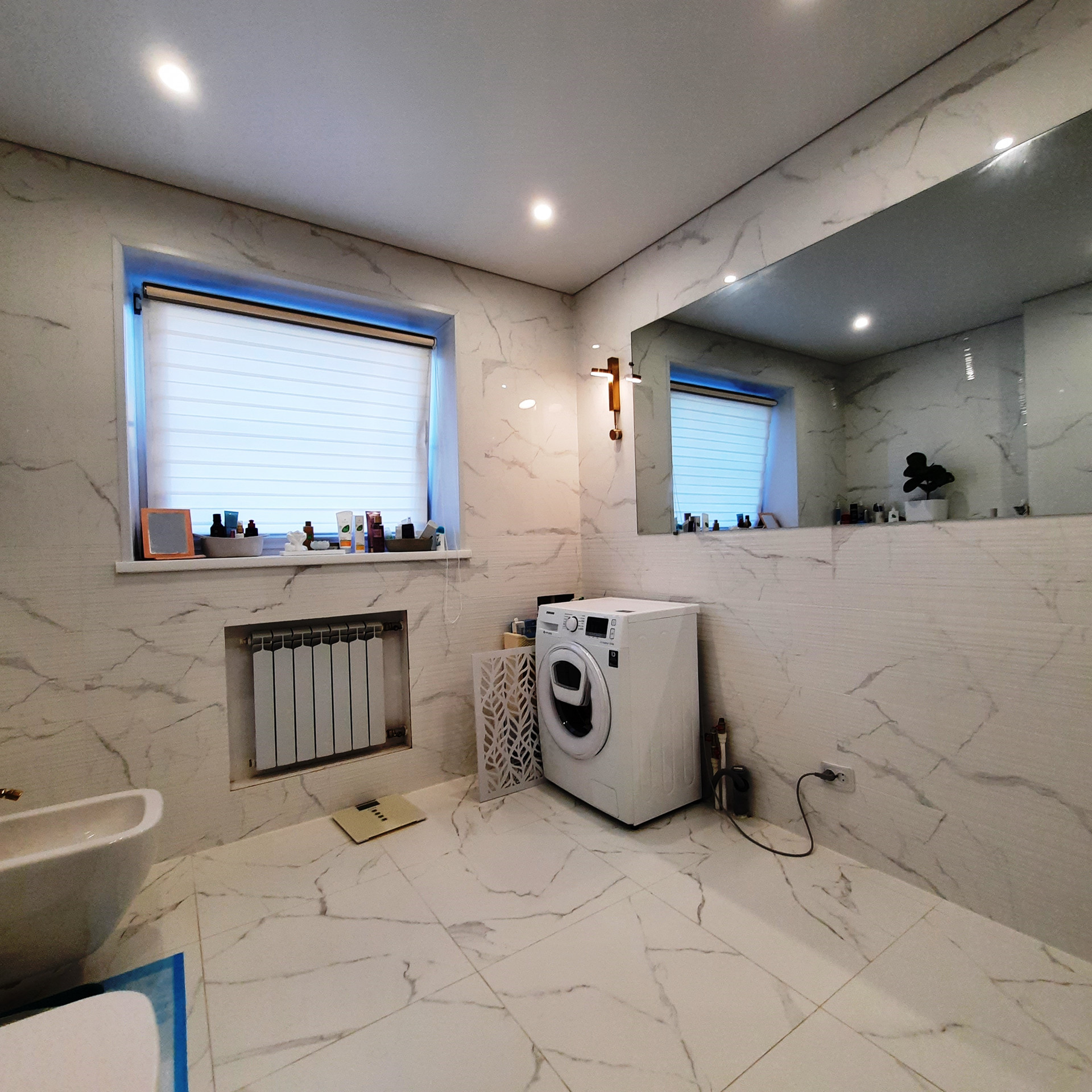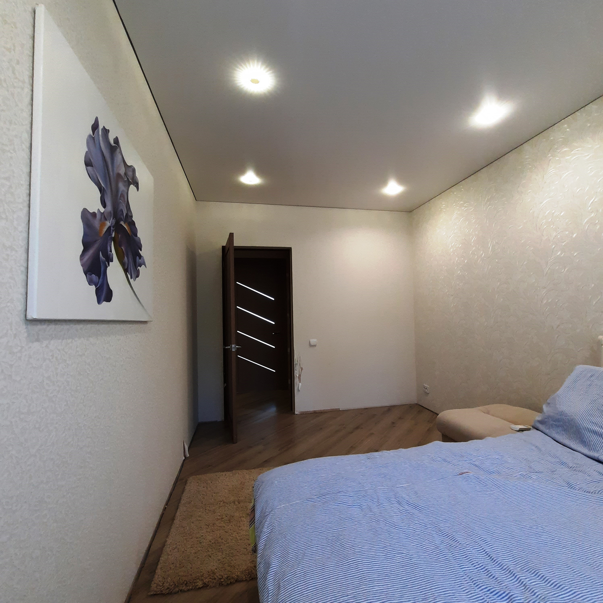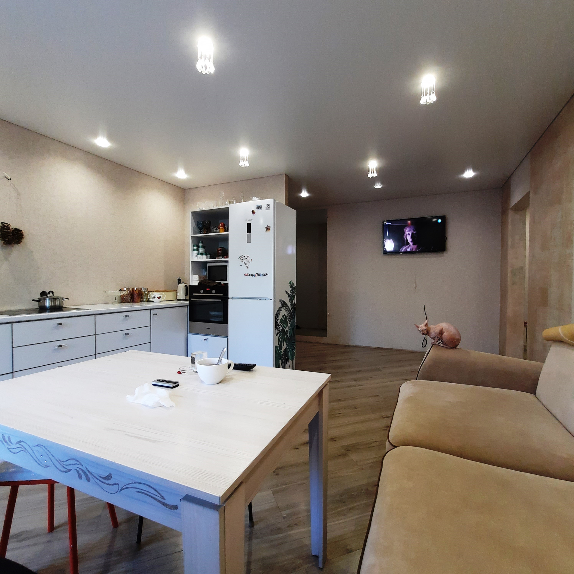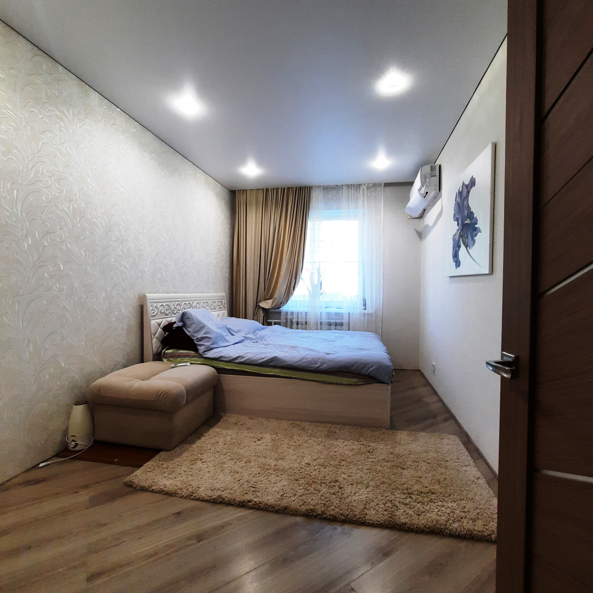 По всей квартире выровнены стены и произведена стяжка полов, уложен качественный ламинат, «тёплые полы» в прихожей и двух детских комнатах, дорогой кафель в санузле (Вам стоит посмотреть отделку «вживую»), новая сантехника и электропроводка, новые радиаторы отопления, натяжные потолки (сатин), новые межкомнатные двери, окна пластик, балкон застеклён (с внутренней отделкой).