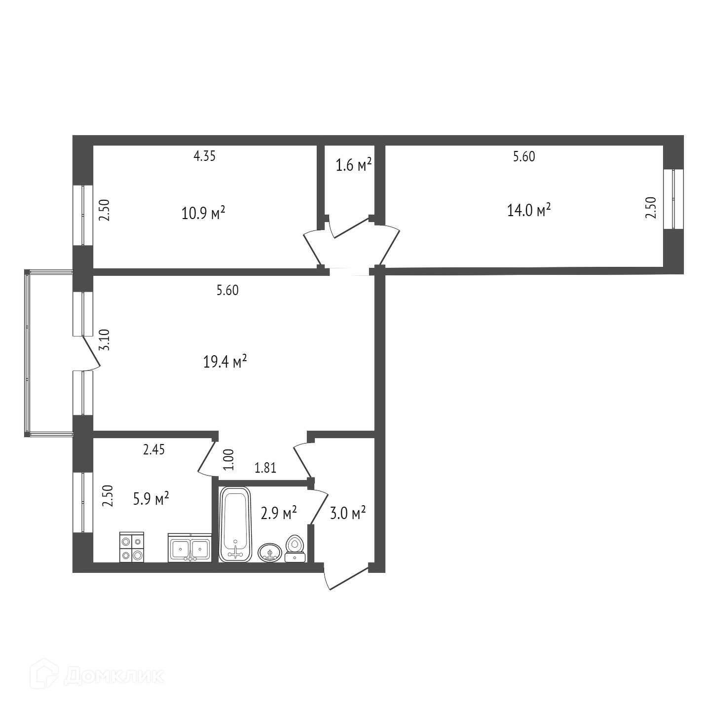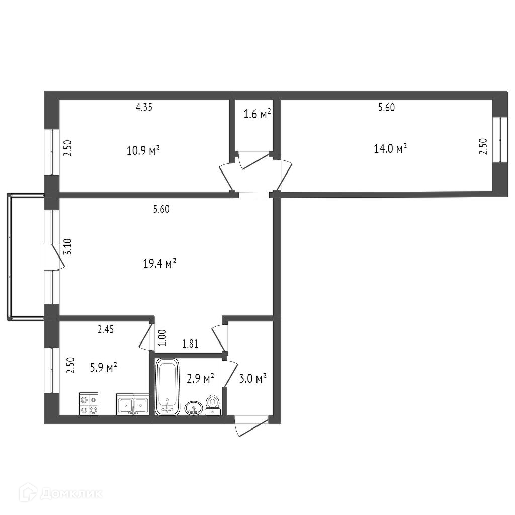 Общая площадь 58.8 м2