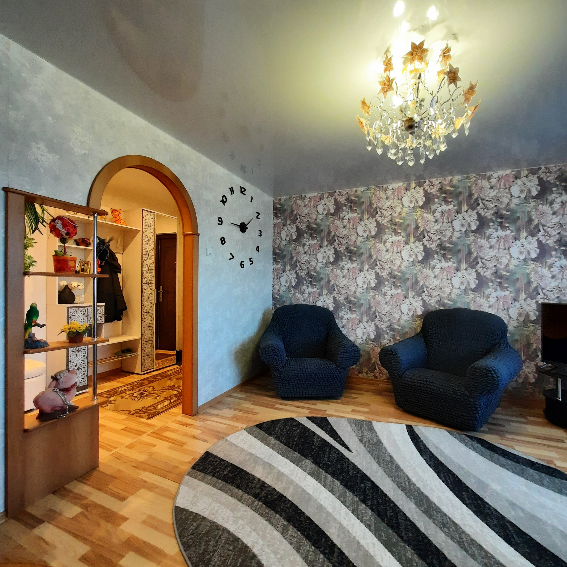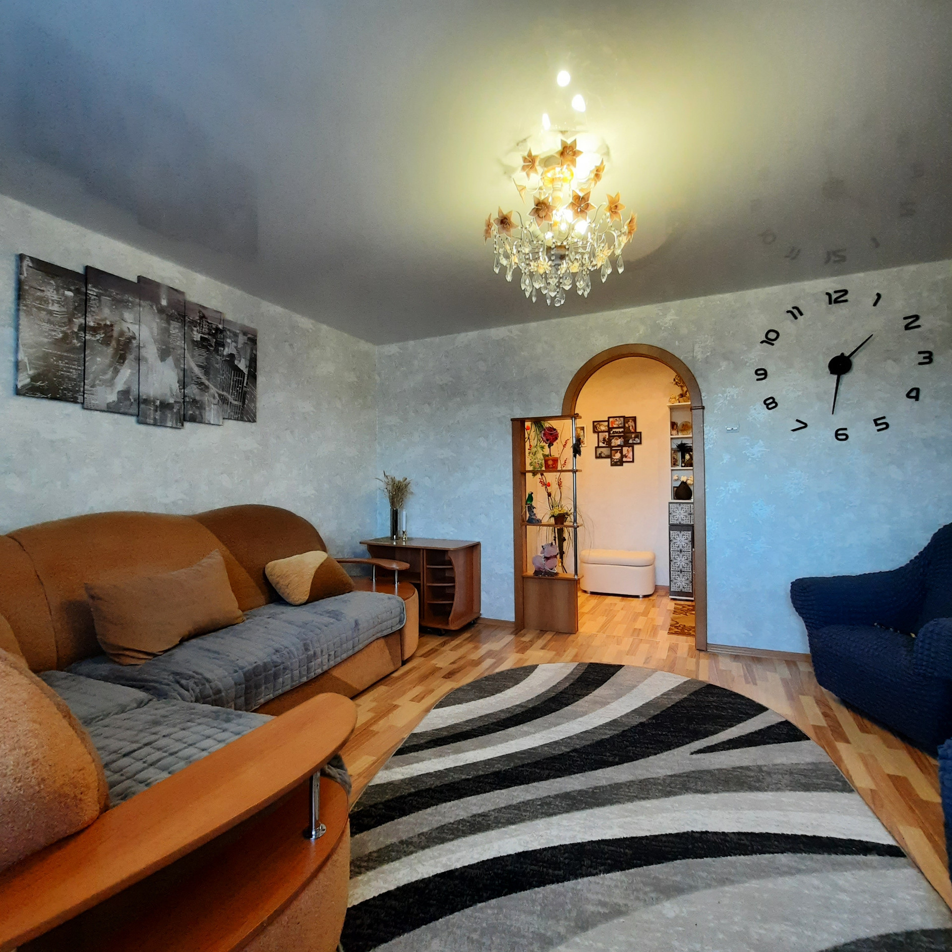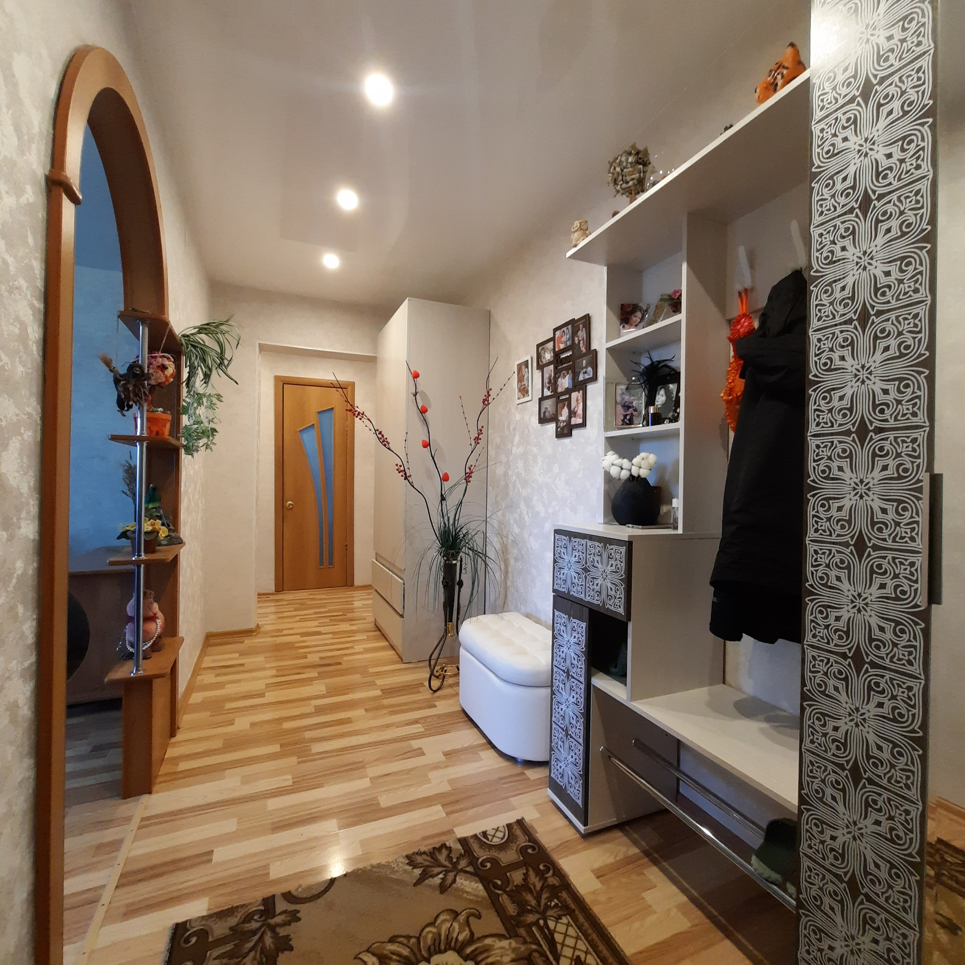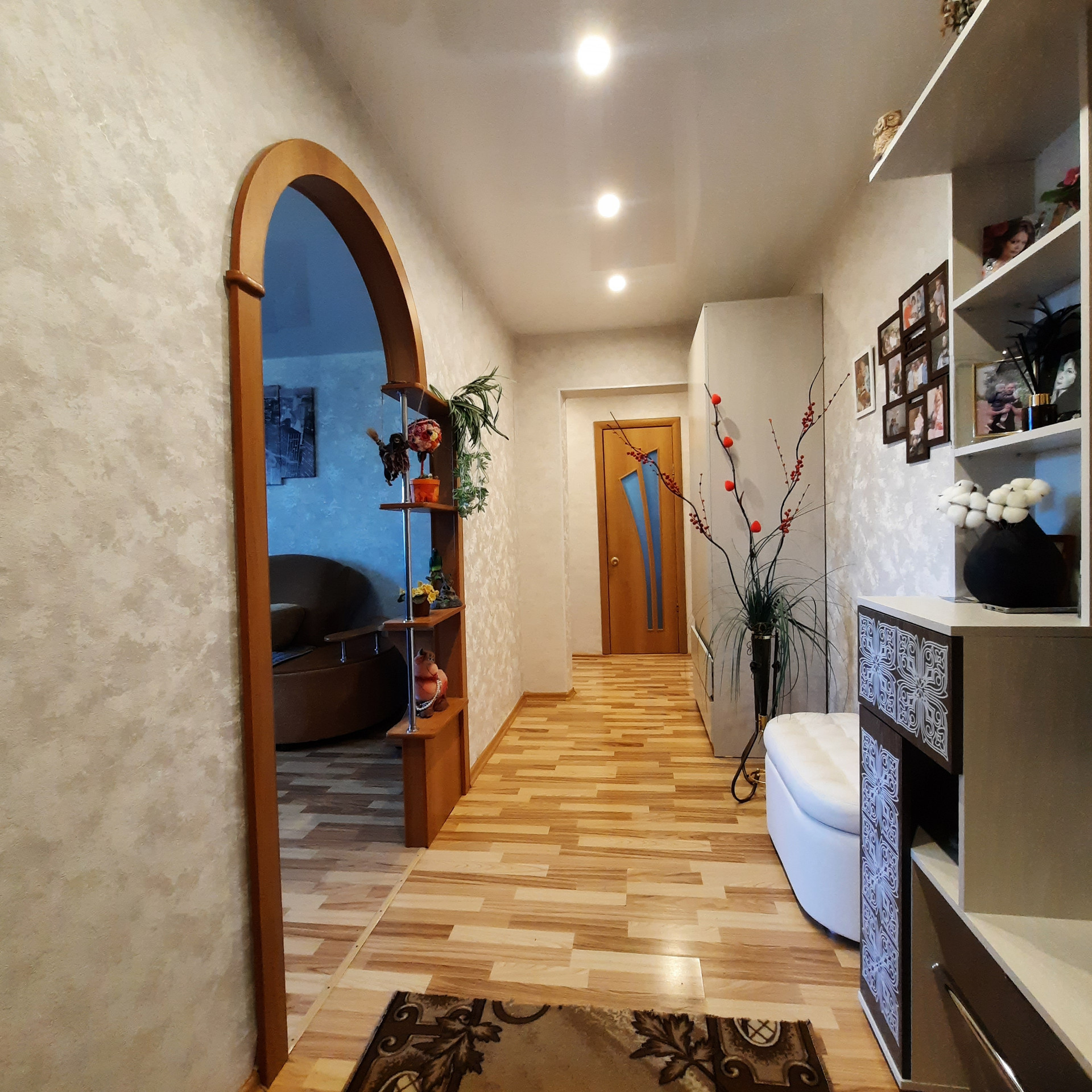- натяжные потолки, ламинат, декоративная арка, заменены межкомнатные двери