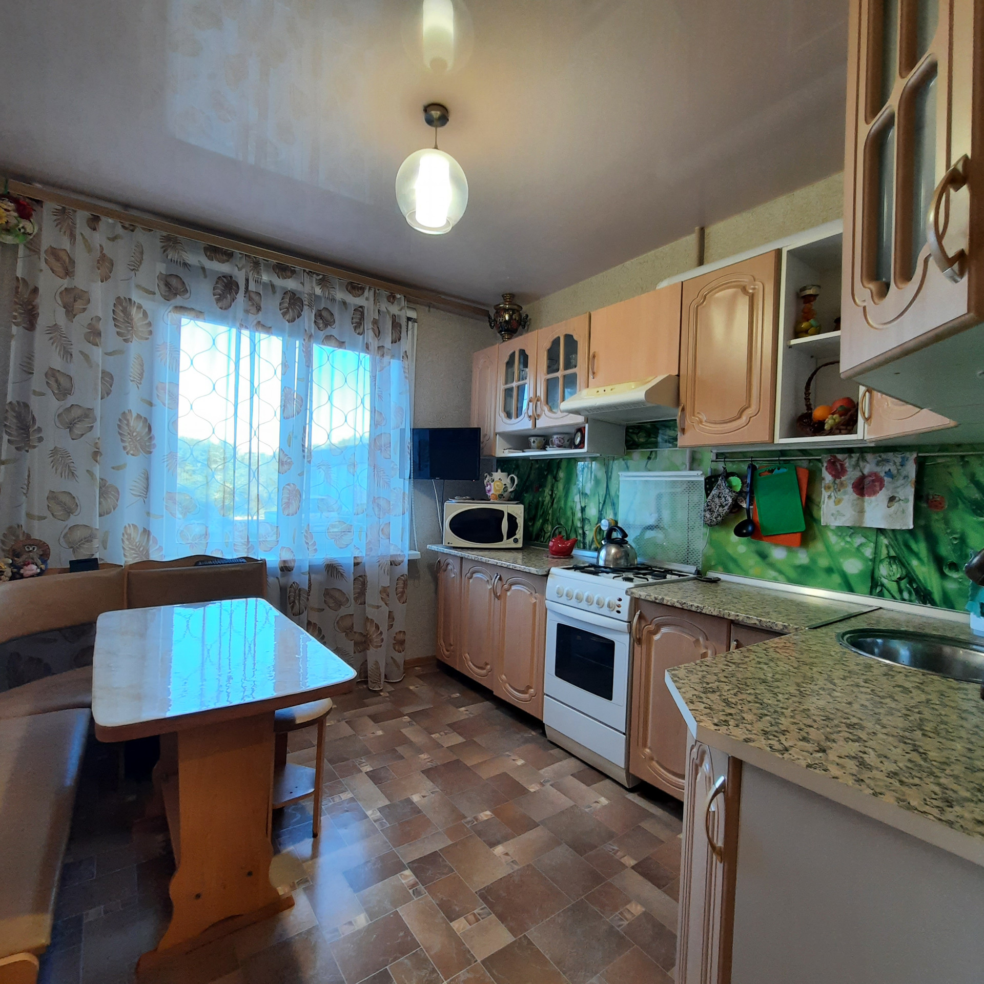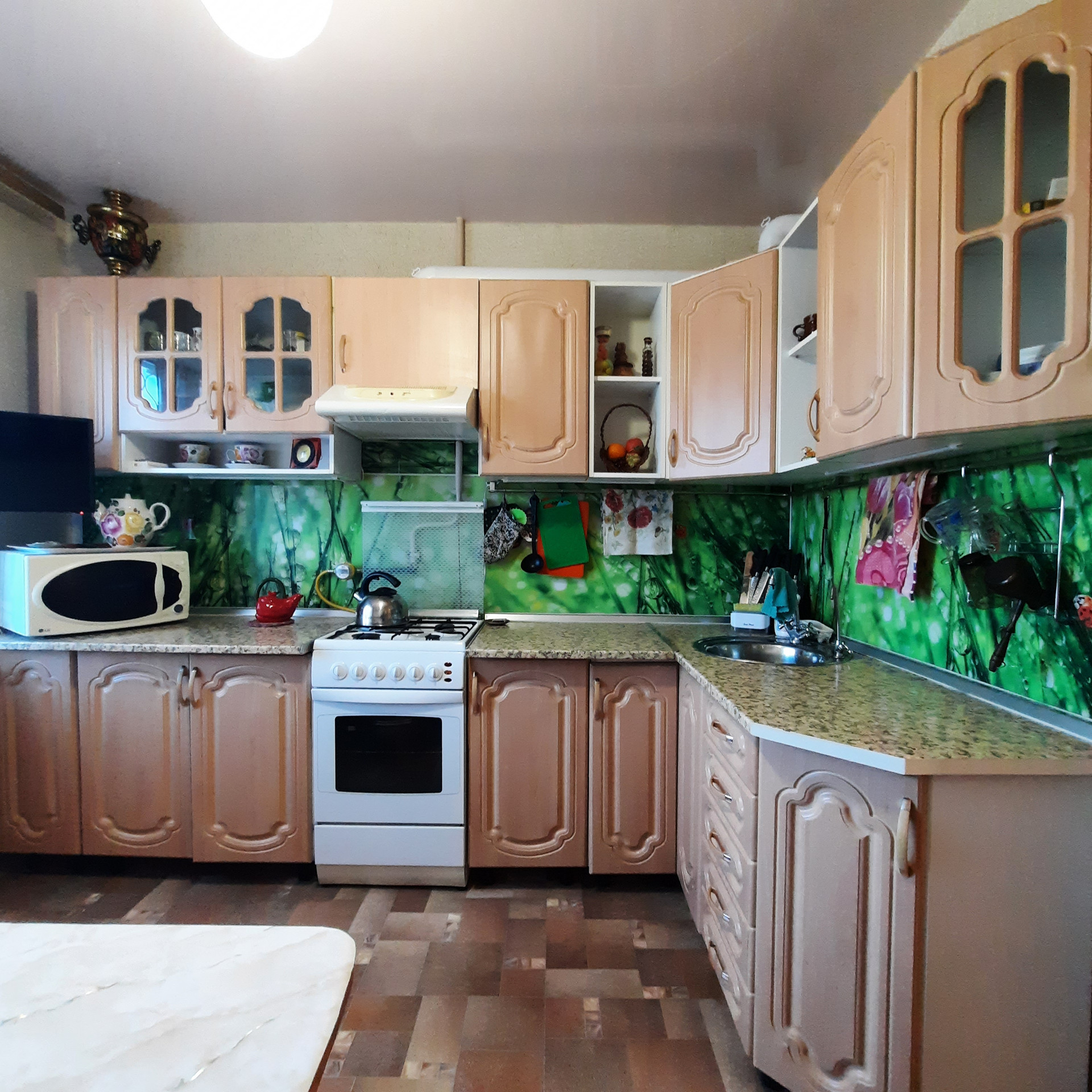 Остаётся: большой кухонный гарнитур, газовая плита, кухонный уголок (стол и диванчик), угловой диван, два кресла