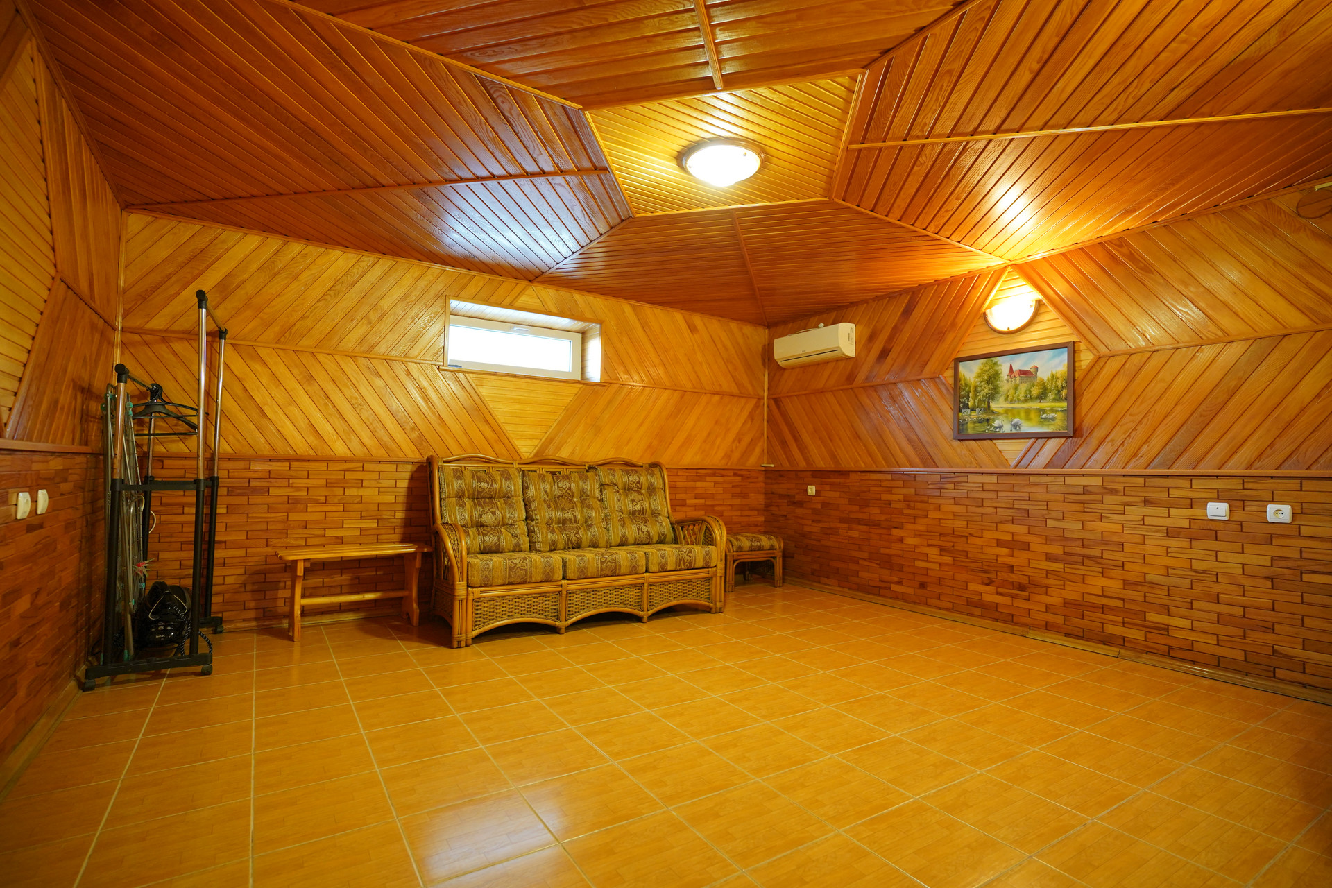 Цокольный этаж (вход с первого этажа по лестнице): комната отдыха, сауна с душем и санузлом, бойлерная, гараж, помещение для хозяйственных нужд.