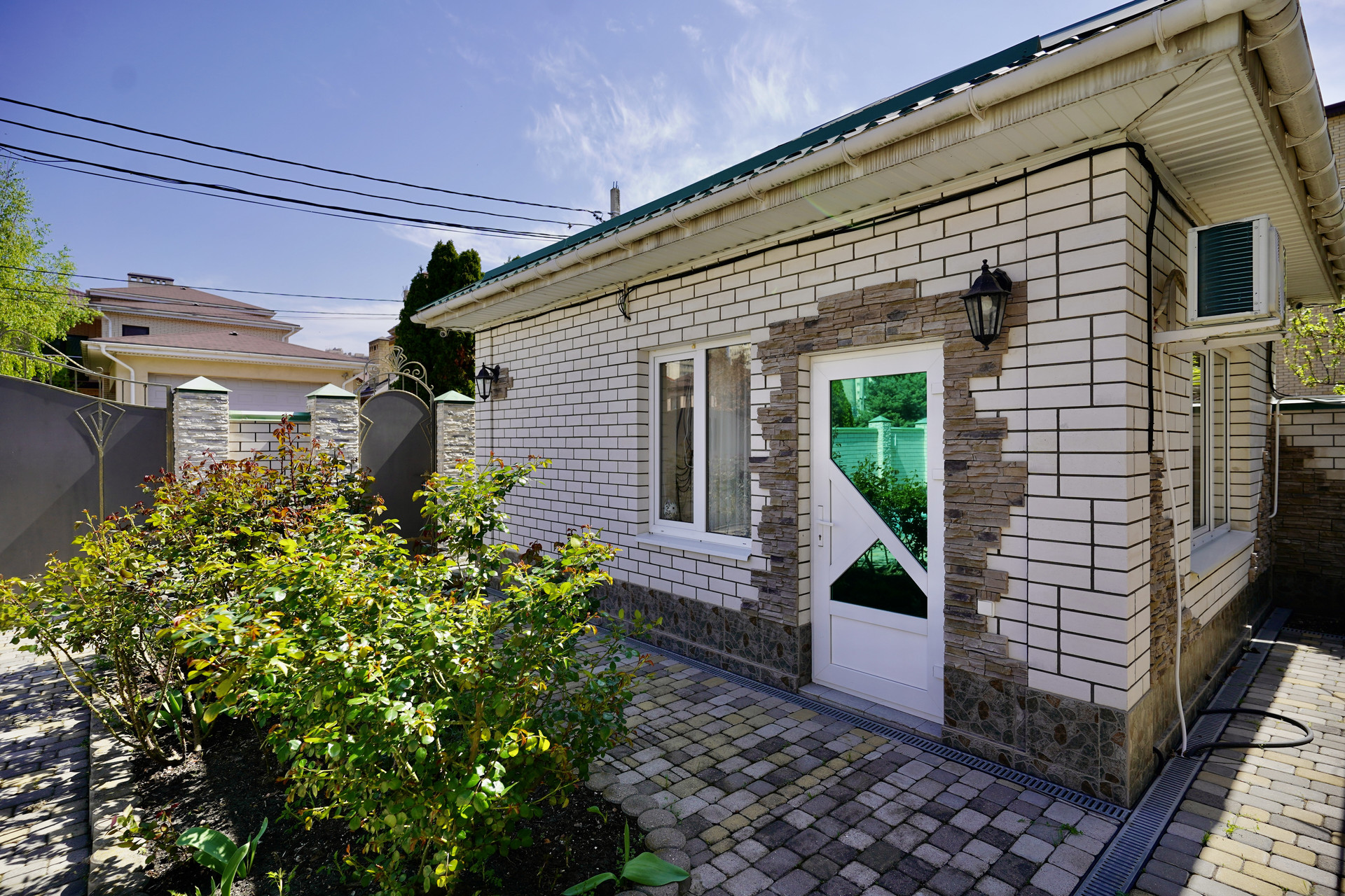 Дом украшают кованные элементы, вся территория уложена тротуарной плиткой, выделены зоны для клумб, посажены кусты роз и декоративные растения.