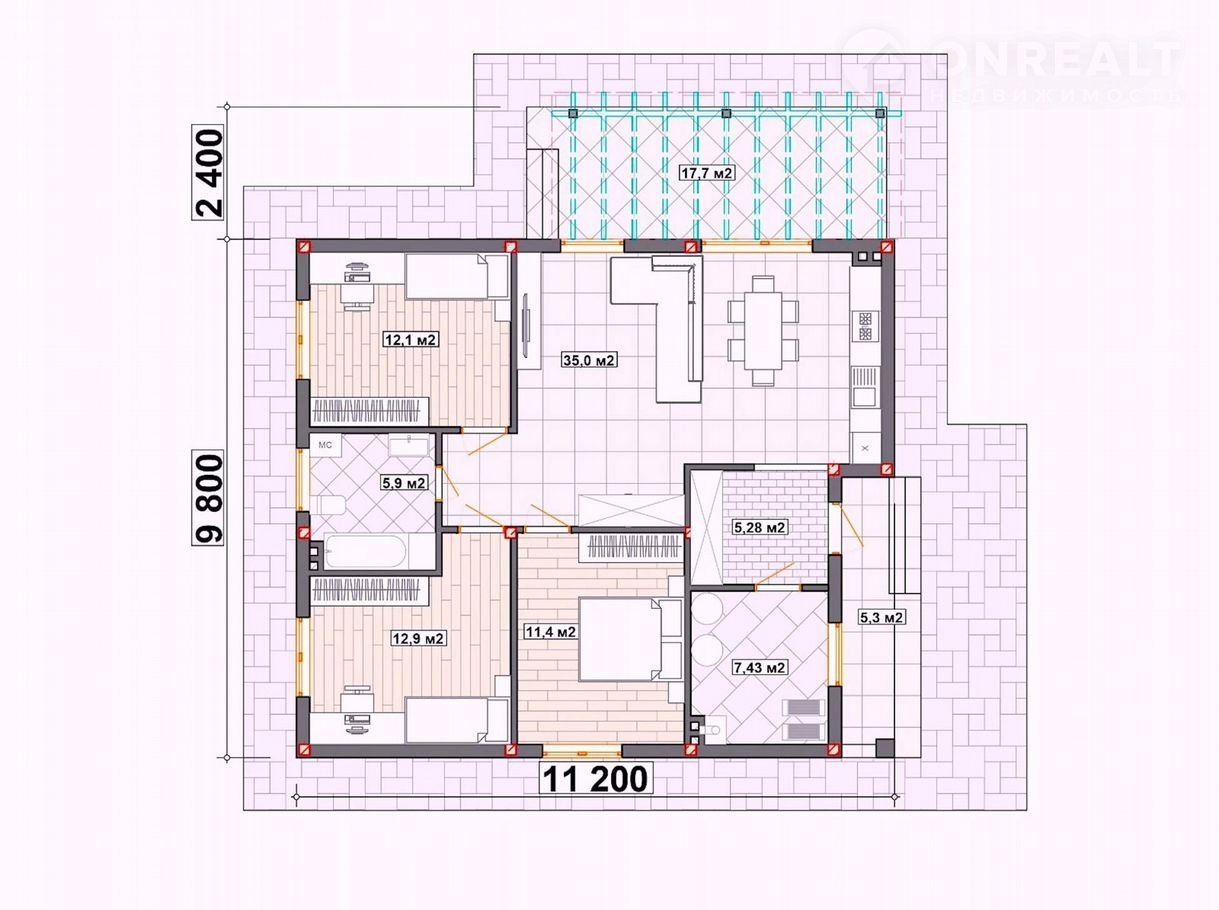 - Kухня: 35 кв.м