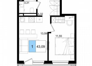 Продается 1-комнатная квартира, 43.1 м2