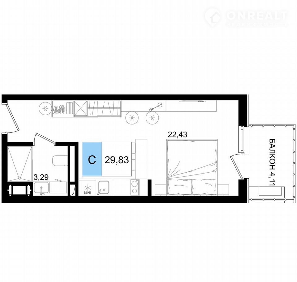 Общая площадь 29.8 м2