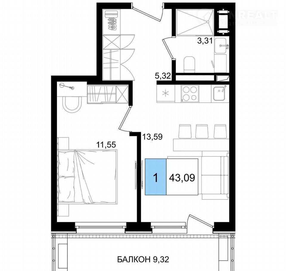 Общая площадь 43.1 м2