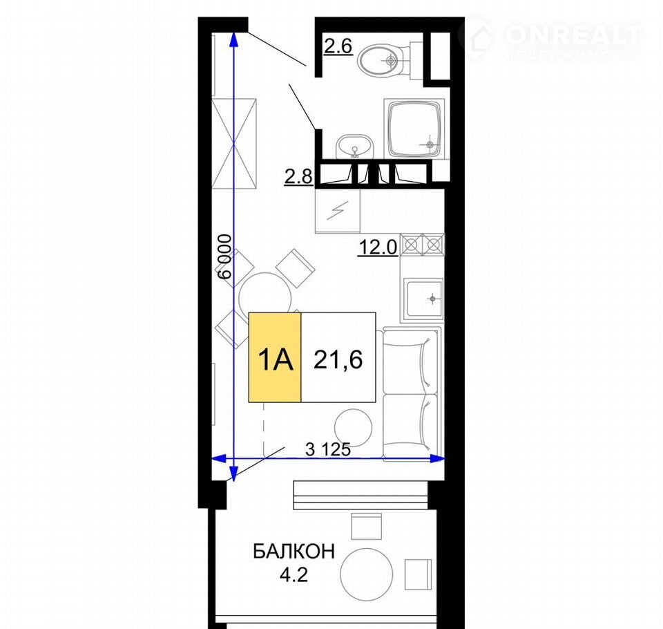 1-комнатная квартира, 21.6 м2, этаж 4 / 9, на продажу в Анапе