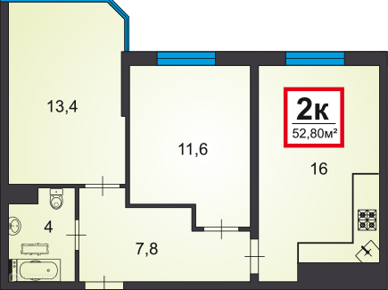 Общая площадь - 52,80 кв. м.