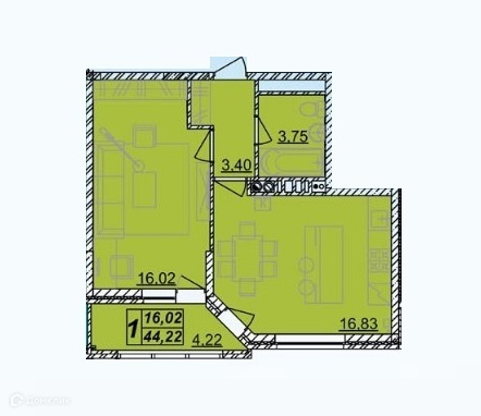 Общая площадь квартиры 44,2 кв м, кухня-гостиная 16,8 кв м, комната 16 кв м.