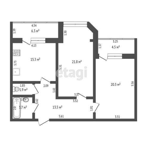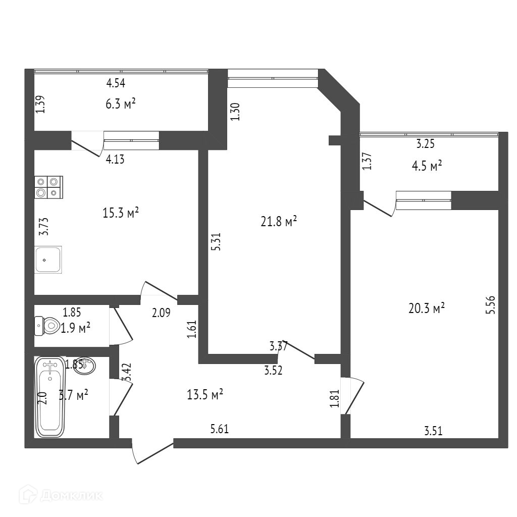 Дом построен из кирпича. Просторная прихожая и две большие изолированные комнаты, в одной из которых есть выход на остеклённую лоджию. Выход на вторую лоджию из кухни-гостиной.