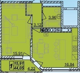 Общая площадь квартиры 44,05 кв м, кухня-гостиная 17 кв м, комната 16 кв м.
