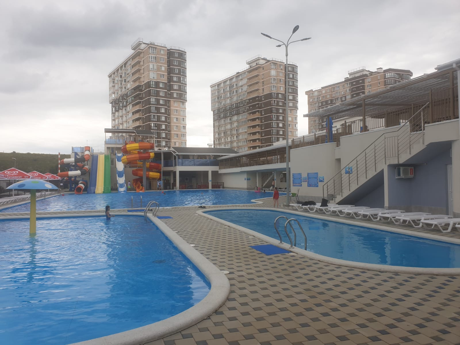 Прям у дома продуктовый магазин, аптека, овощной магазин, спа, закрытый бассейн с тренажерным залом, также открытый бассейн с мини аквапарком.