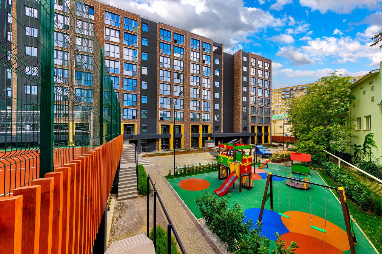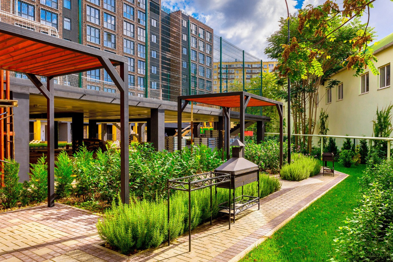 * Внутри расположен двор со спортивными и детскими площадками и барбекю зоной.