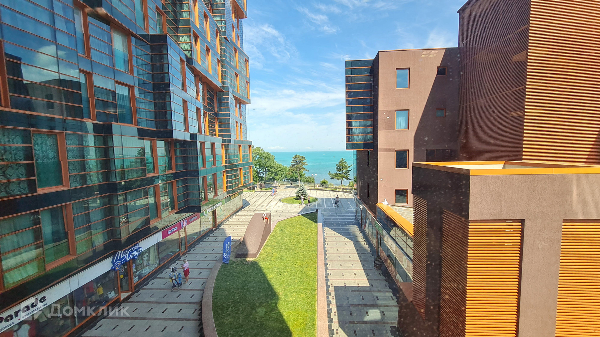 Из окон открывается вид на море и на зелёный двор.