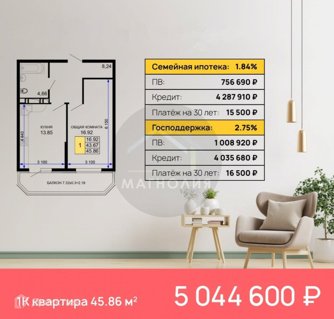 Арт. 32898240 Стоимость указана за 1-комнатую планировку