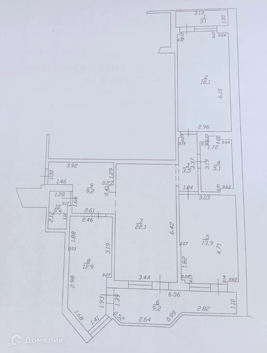 Общая площадь квартиры в месте с двумя лоджиями составляет 99.6м2,  комнаты 22.1м2 / 18.1м2 / 13.9м2,  кухня 12.9м2. Лоджия со стороны улицы Крымской 9.2м2 и лоджия выходящая во внутренний двор 3.1м2.