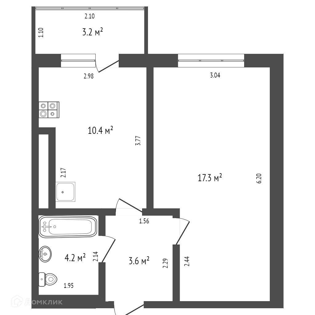 Общая площадь квартиры составляет 35,5 кв.м + балкон, кухня площадью 10,4 кв.м., просторная жилая комната - 17,3 кв.м., большой совмещенный санузел.