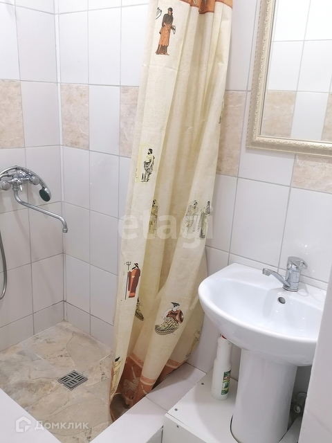 На полу кафельная плитка, теплый пол. На стенах обои. Натяжной потолок. Хорошее освещение. Окно. Вентиляция. Санузел оборудован - унитаз, душевая кабина, раковина, водонагреватель, стиральная машина.