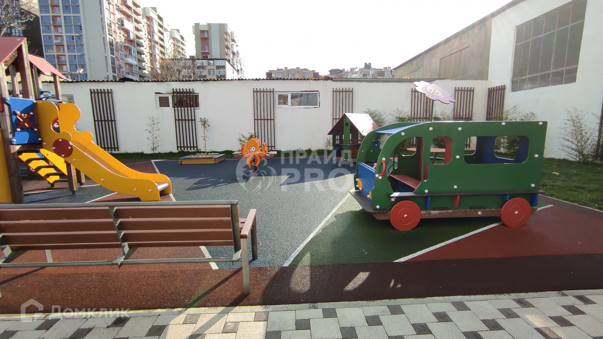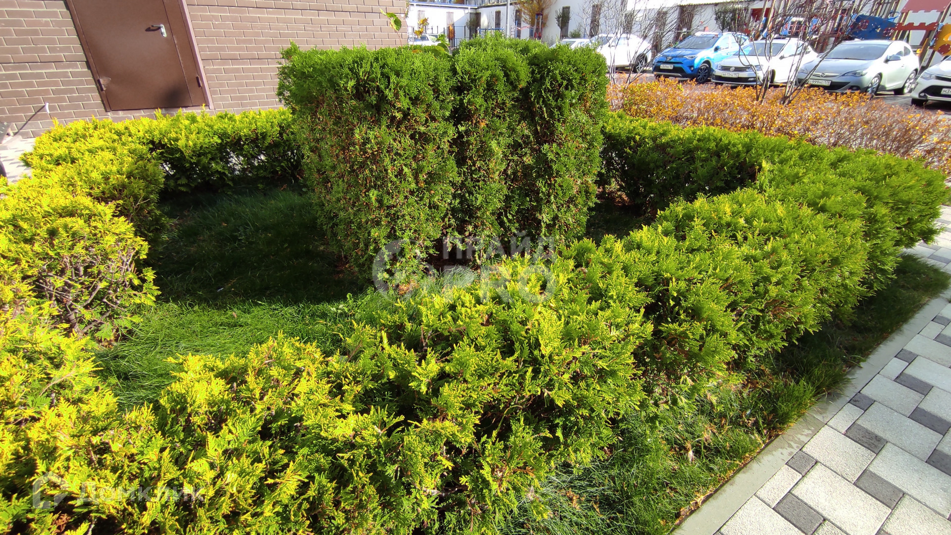 Во дворе детские, спортивная площадка и большая парковка.