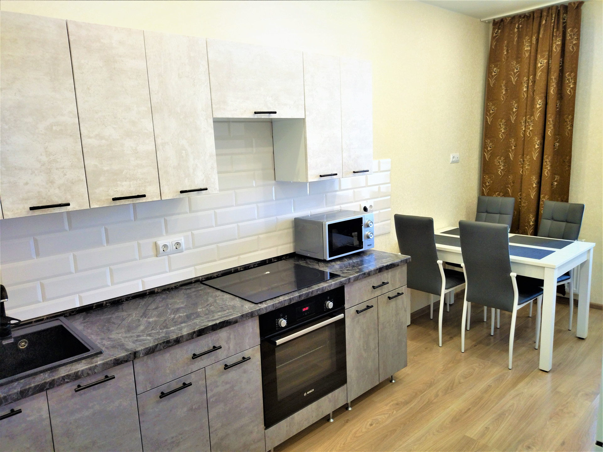 В квартире установлены евро пакеты, балкон остеклен. Качественные обои и межкомнатные двери, натяжные потолки, пол- ламинат и кафель, отличная входная дверь. Радиаторы отопления с терморегуляторами. Так же в квартире установлены две сплит-системы кондиционирования воздуха. В квартире по согласованию остается кухонный гарнитур с встраиваемой техникой, а так же остальная мебель и техника.