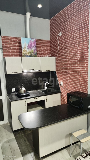 Вся мебель и техника остаётся: кухонный гарнитур, электрическая плита, холодильник, микроволновка, барный стол, диван, телевизор. Санузел совмещённый, полностью оборудован.