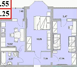 Кухня - 11 м2, комнаты - 18 и 19 м2.